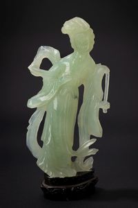 h cm 17 raffigurante dama con fiori (base in legno) 绿玉仕女与花 (木底座)。 中国,19 世纪