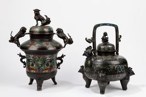 Due incensieri in bronzo e smalto. Giappone, inizi secolo XX