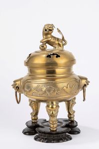 h max cm 44 uno con anse e coperchio sormontati da cani di pho, l'altro con manico decorato con maschere a guisa [..]