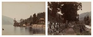 Due stampe all'albumina colorate a mano montate fronte retro a cartoncino originale, cm 20,4 x 26 circa ciascuna [..]