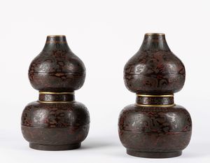 Coppia di vasi a doppia zucca in legno laccato. Cina secolo XX