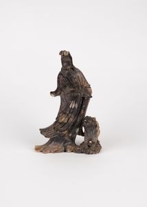 Gruppo in pietra saponaria raffigurante Guanyin con cane di pho. Cina, fine dinastia [..]