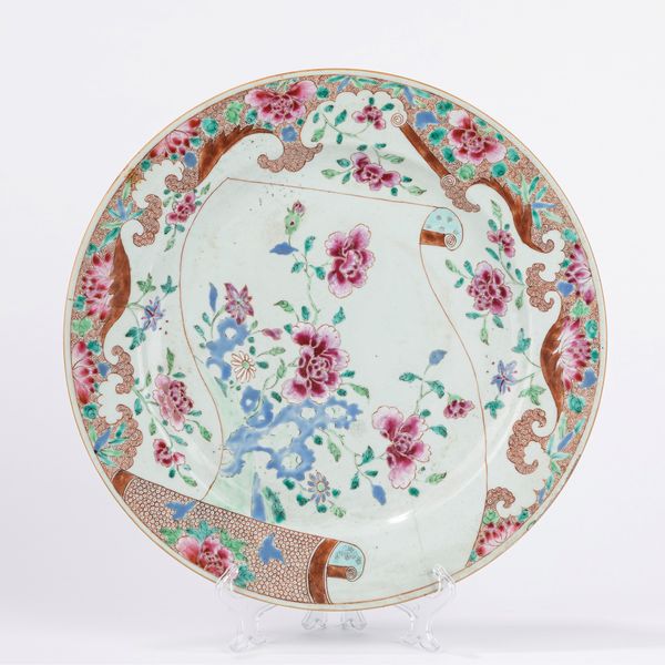 Piatto in porcellana famiglia rosa, decorato a motivi floreali. Cina, secolo XVI [..]