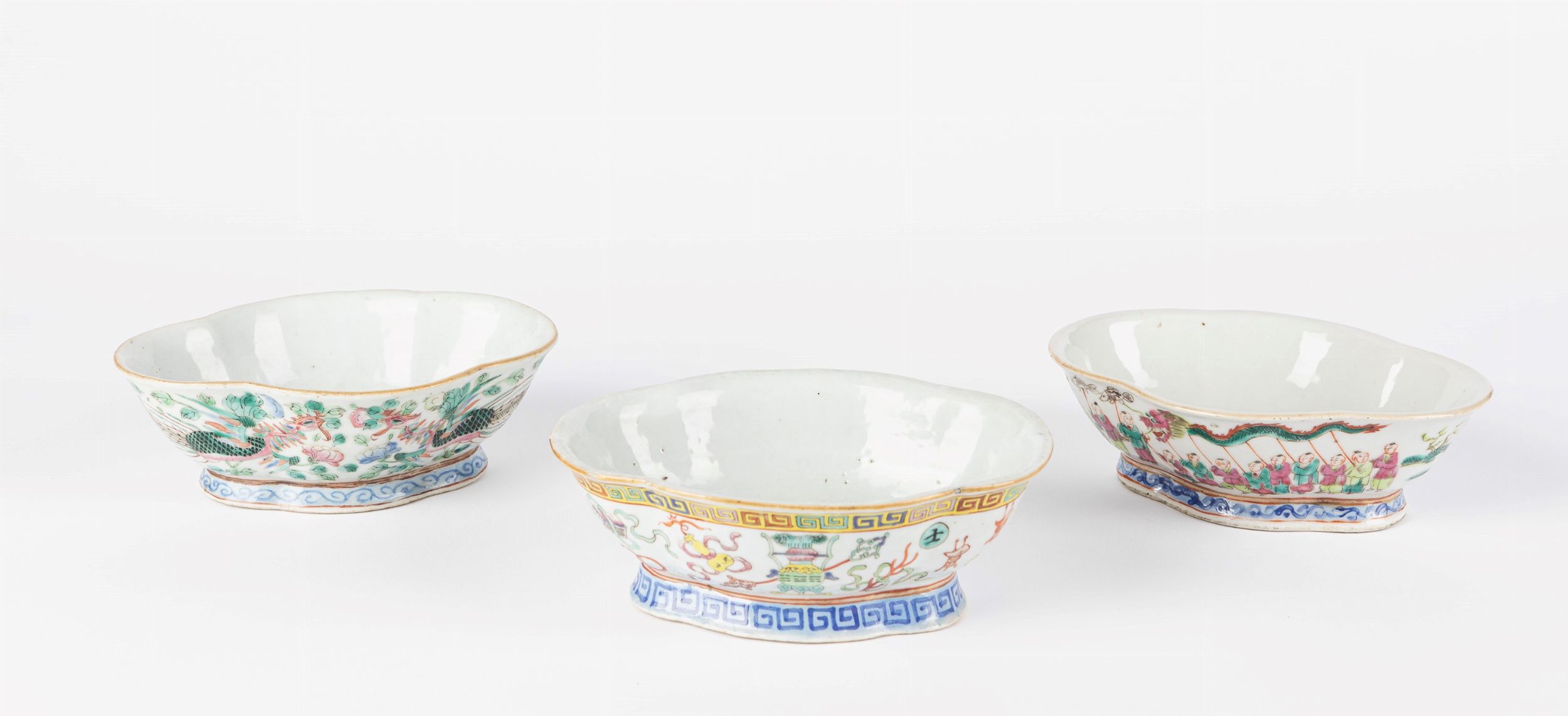 Tre alzatine in porcellana Famiglia Rosa. Cina, secolo XX