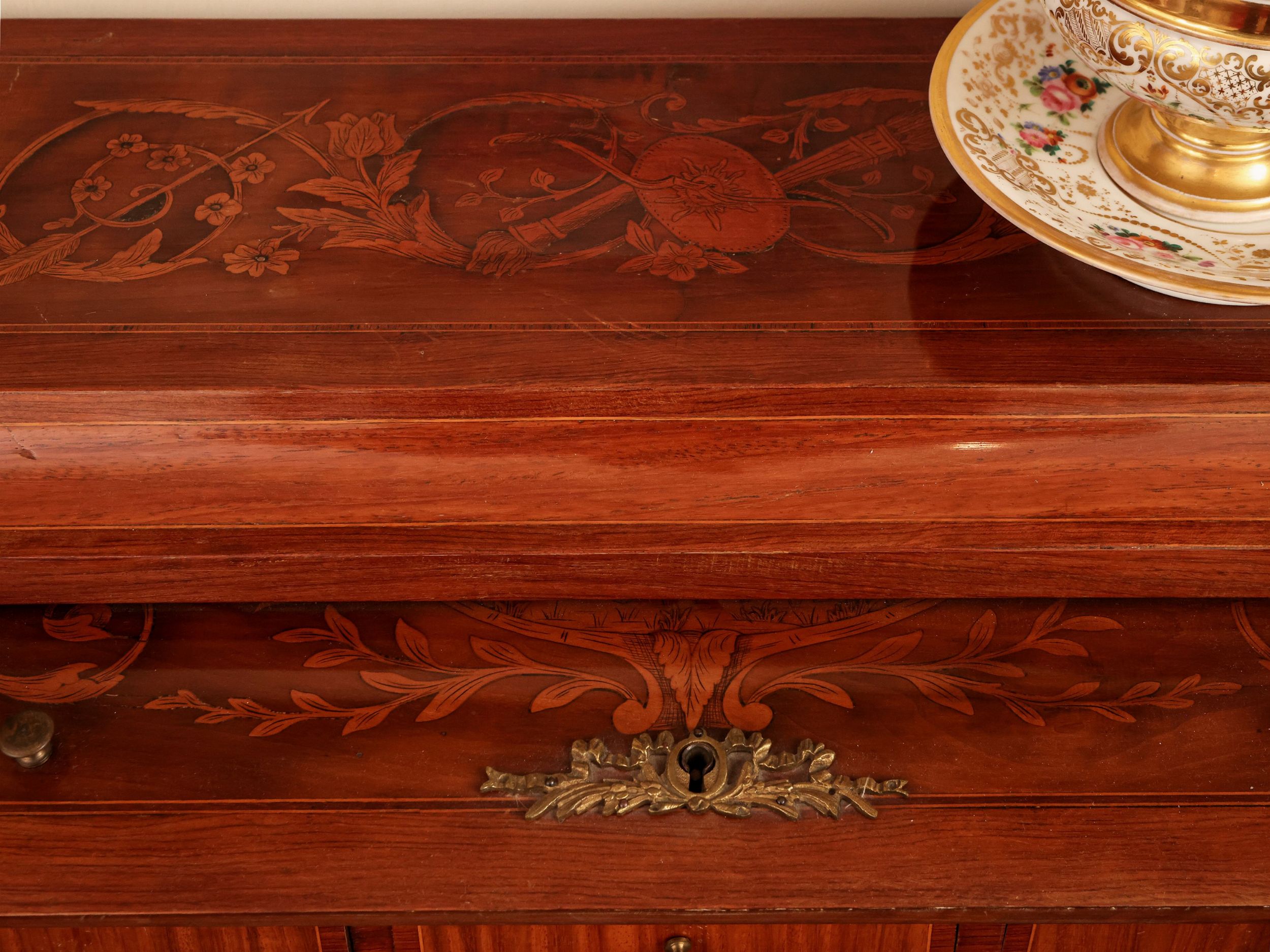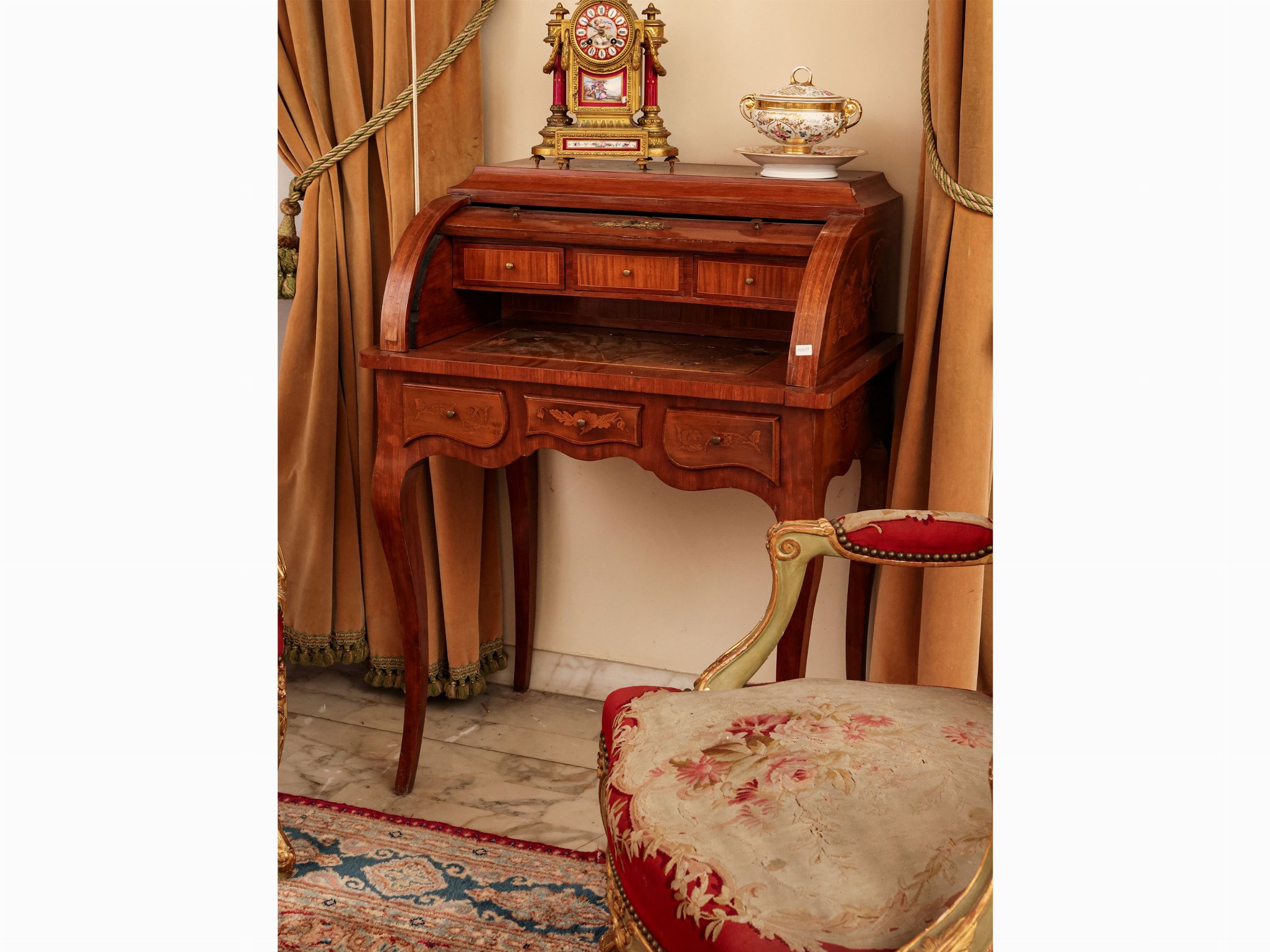 h cm 98x73x50 XX secolo di gusto settecentesco, scrittoio a rullo intarsiato con episodio della favola di Esopo La volpe e la cicogna, piano a tiretto rivestito in cuoio, gambe mosse, alcuni difetti