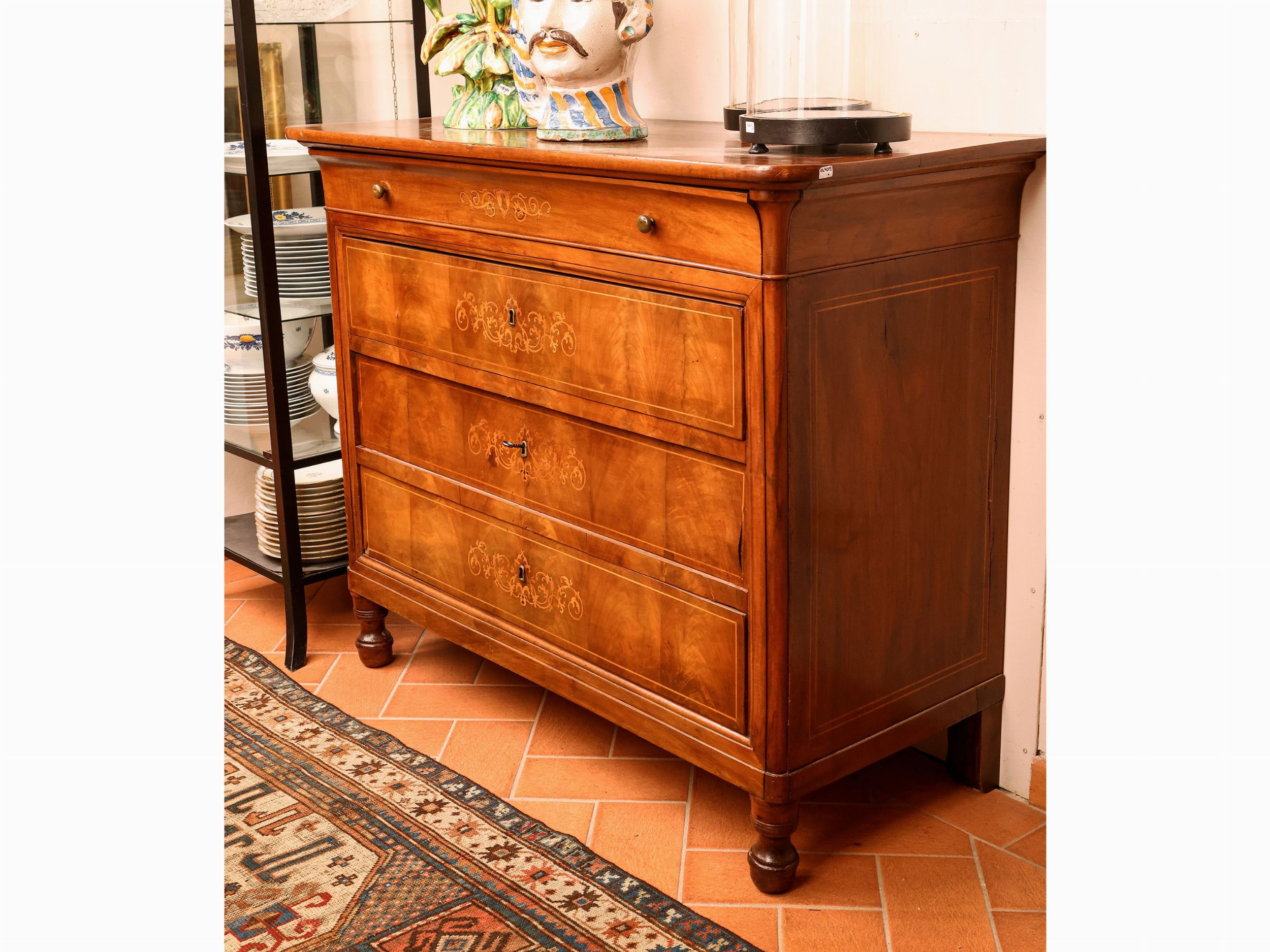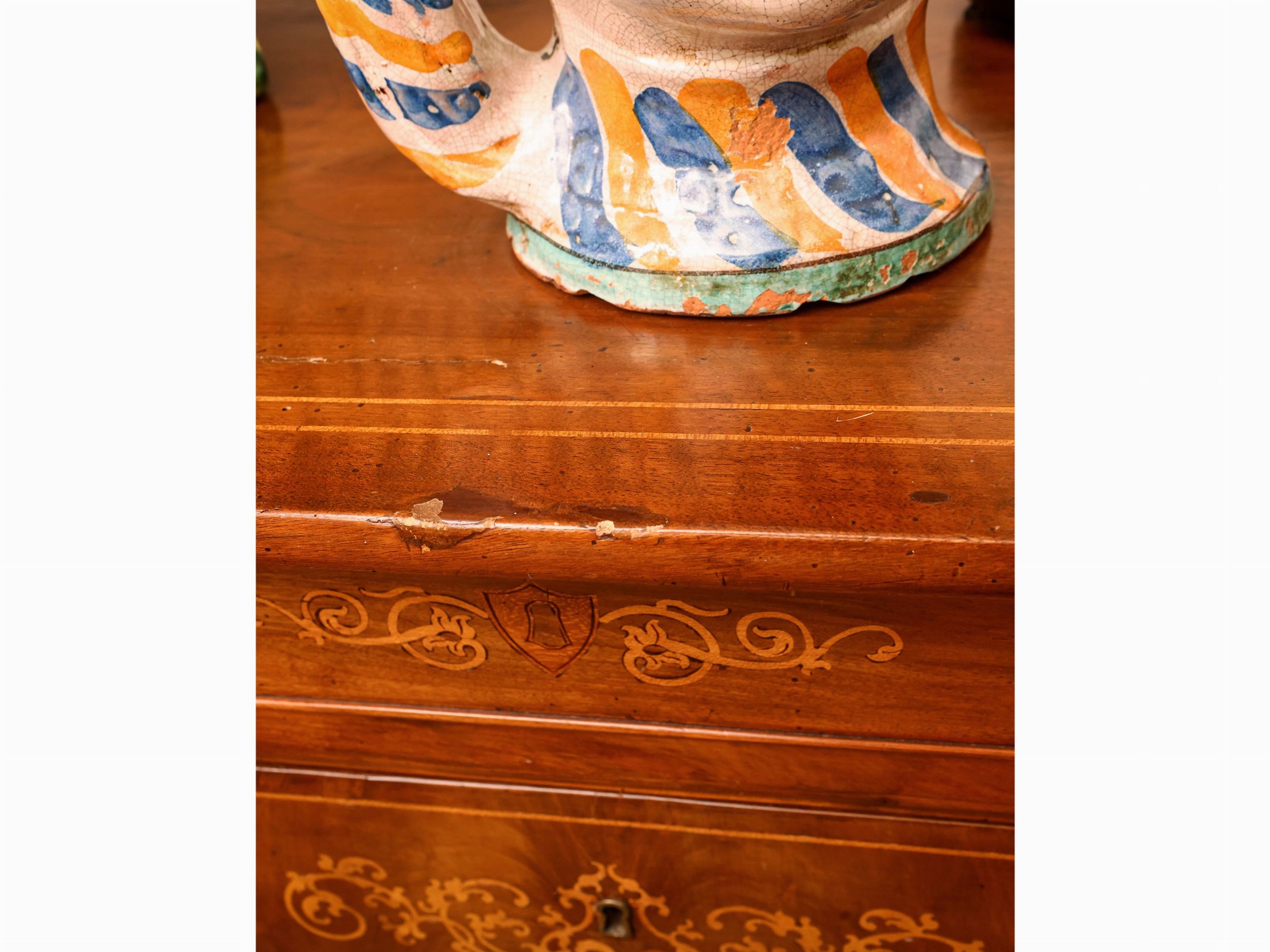 prima metà del XIX secolo un cassetto sotto il piano ed altri tre sottostanti intarsiati con volute e girali in legni di frutto, piedi a cipolla