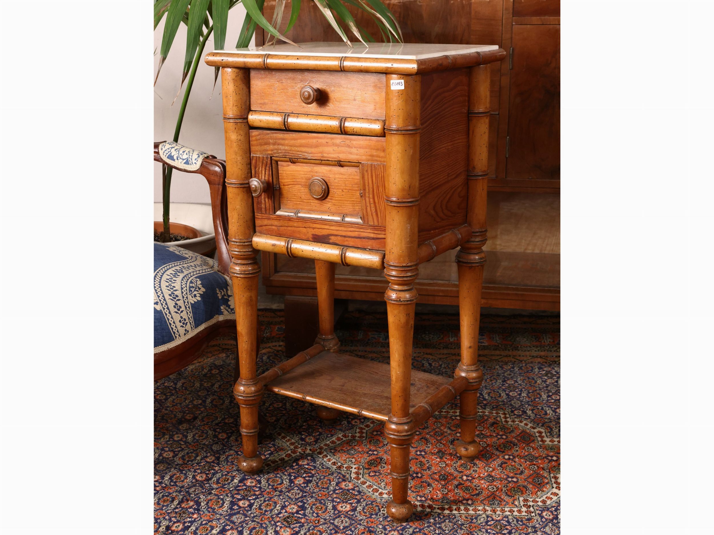 realizzato ad imitazione del bambù, piano in marmo, un cassetto ed uno sportello sul fronte, gambe riunite da traversa, alcuni difetti