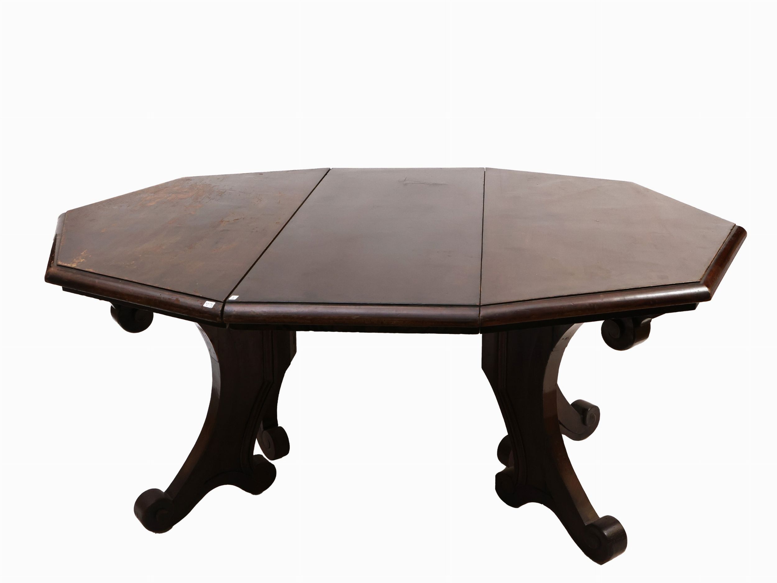 h cm 80x125x66, prolunga cm 50x131 prima metà del XX secolo piani trapezoidali, due sostegni desinenti a voluta, corredati di prolunga per trasformarli in un unico tavolo di forma ottagonale, alcuni difetti