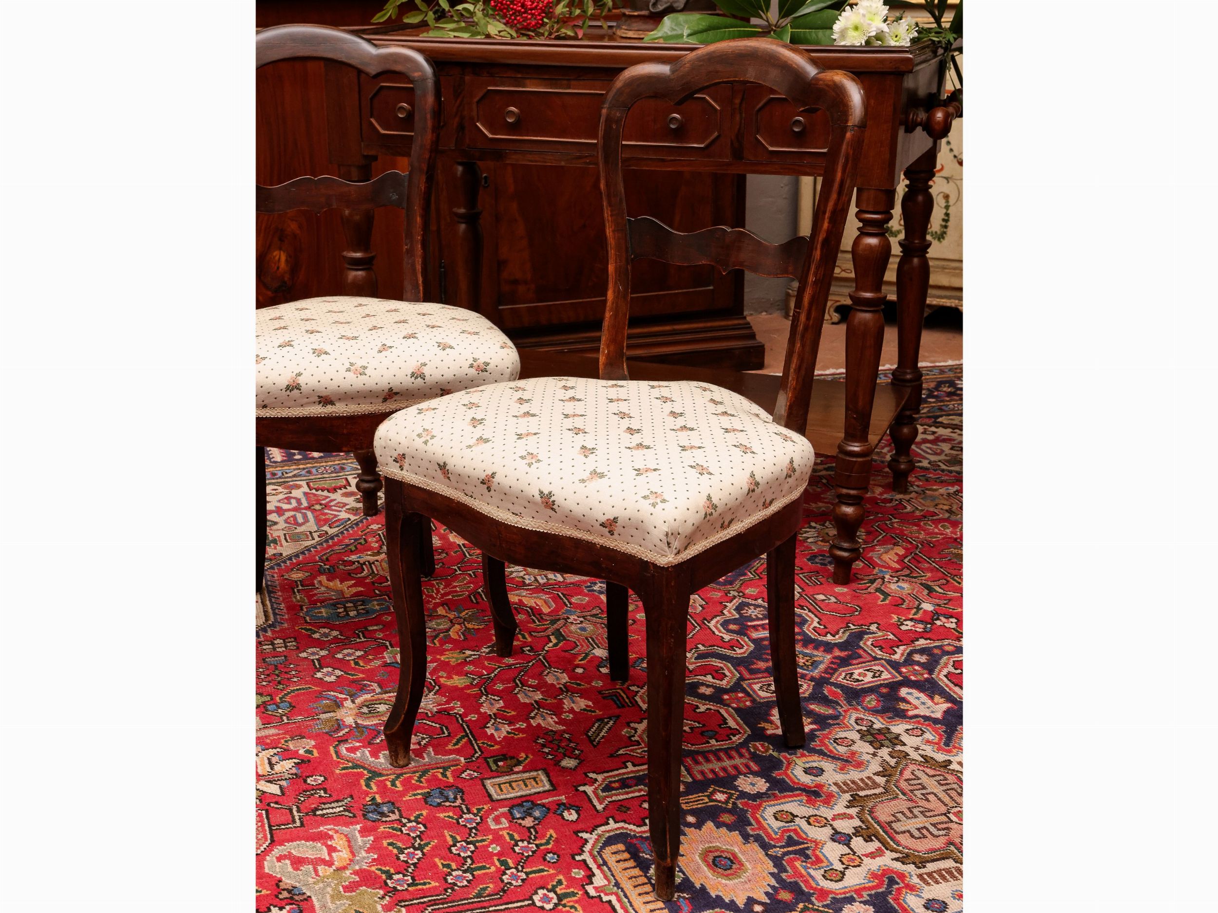 seconda metà del XIX secolo schienale trilobato, gambe anteriori mosse, sedili imbottiti e rivestiti in tessuto a piccoli motivi floreali