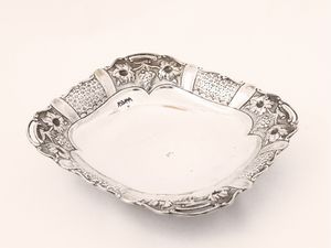 gr 290, cm 20x20 di forma quadrangolare, sbalzato con motivo di foglie di vite e uva