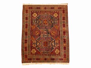 cm 160x115 impianto geometrico su campo nei toni del rosso, medaglione contrale a losanga uncinata