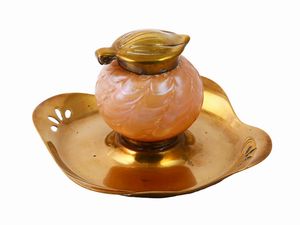 h. h cm 7 d cm 12 Austria, 1900 circa in vetro iridescente e madreperlato su piattino in ottone sagomato e tr [..]
