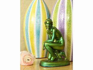 Figura femminile in ceramica smaltata a lustro nei toni del verde, Zsolnay