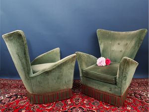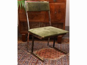 h cm 88x49x50 (4) Italia, Anni Settanta seduta e schienale rivestiti in pelle di camoscio color verde, struttura [..]