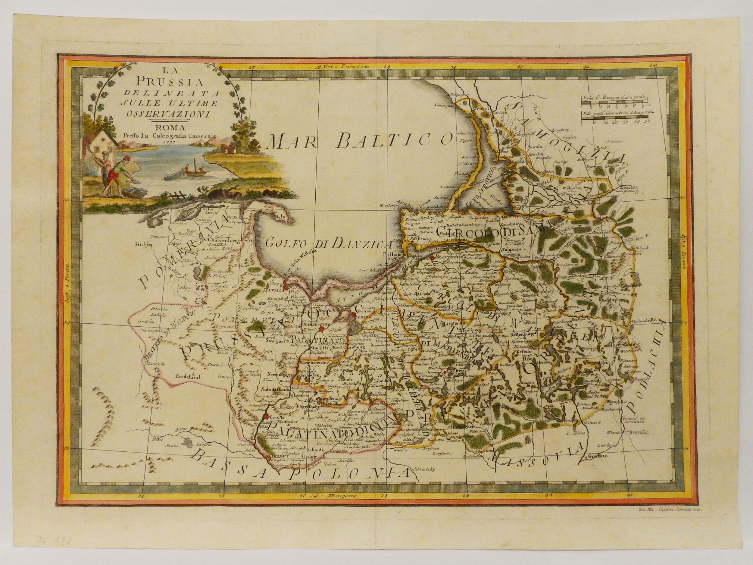 foglio cm 41x54,5, matrice cm 37x50 (1745-c.1824) incisione a doppia pagina con acquerellatura, titolo entro cartiglio decorato con paesaggio marino con pescatori, l'opera è applicata ad altro supporto cartaceo postumo