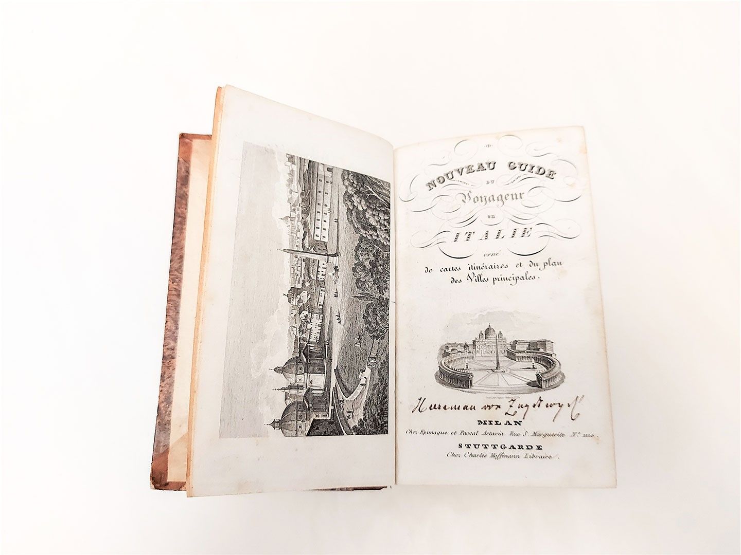 Milan: Chez Epimaque et Pascal Artaria Stuttgarde: Chez Charles Hoffmann Libraire (sul v. dell'occhietto: Imprimé par François Sonzogno q.m J. B. à Milan Rue de la Spiga N.° 1395 en octobre 1829) ... orné de cartes itinéraires et du plan des Villes principales In-8° (175x110 mm) XLI, [1], 802, [4] p., 14 c. di tav. compresa la veduta di Roma all'antiporta. Mancanti 7 tav. Legatura in mz. pelle con fregi e titolo in oro su tassello al dorso e cartiglio di vecchia collocazione, difetti, in particolare al piatto posteriore. Tagli gialli, spruzzati. Fioriture sparse, gora alle pp. X-XXIII. Carta geografica dell'Italia con restauro