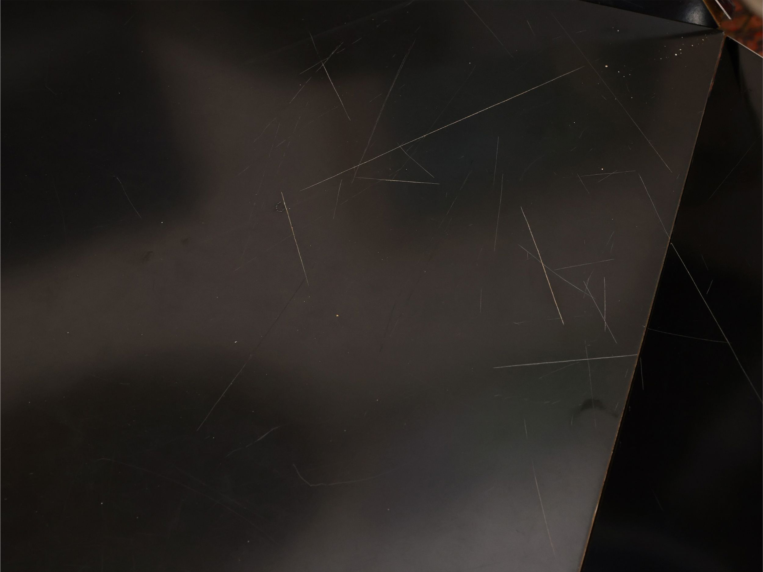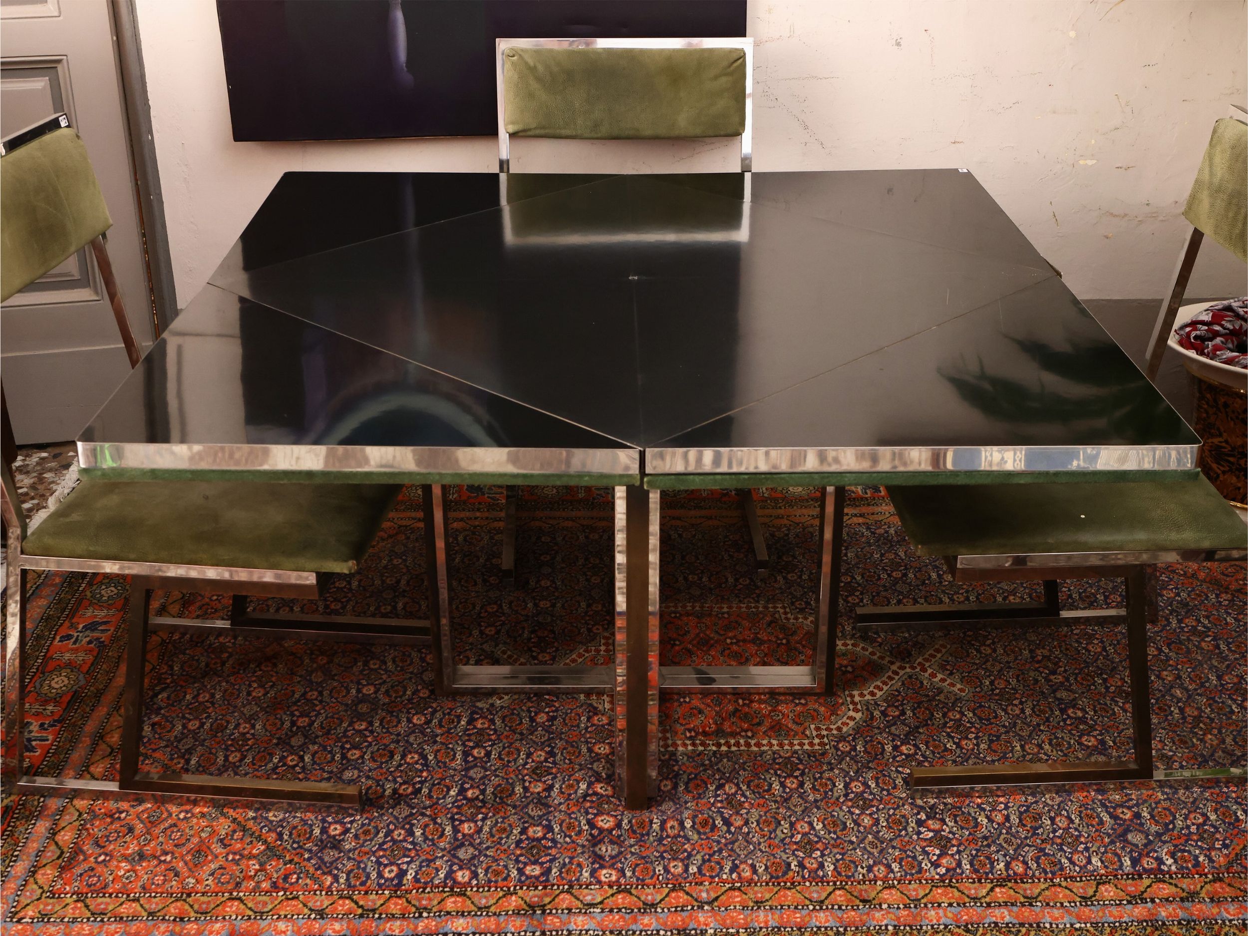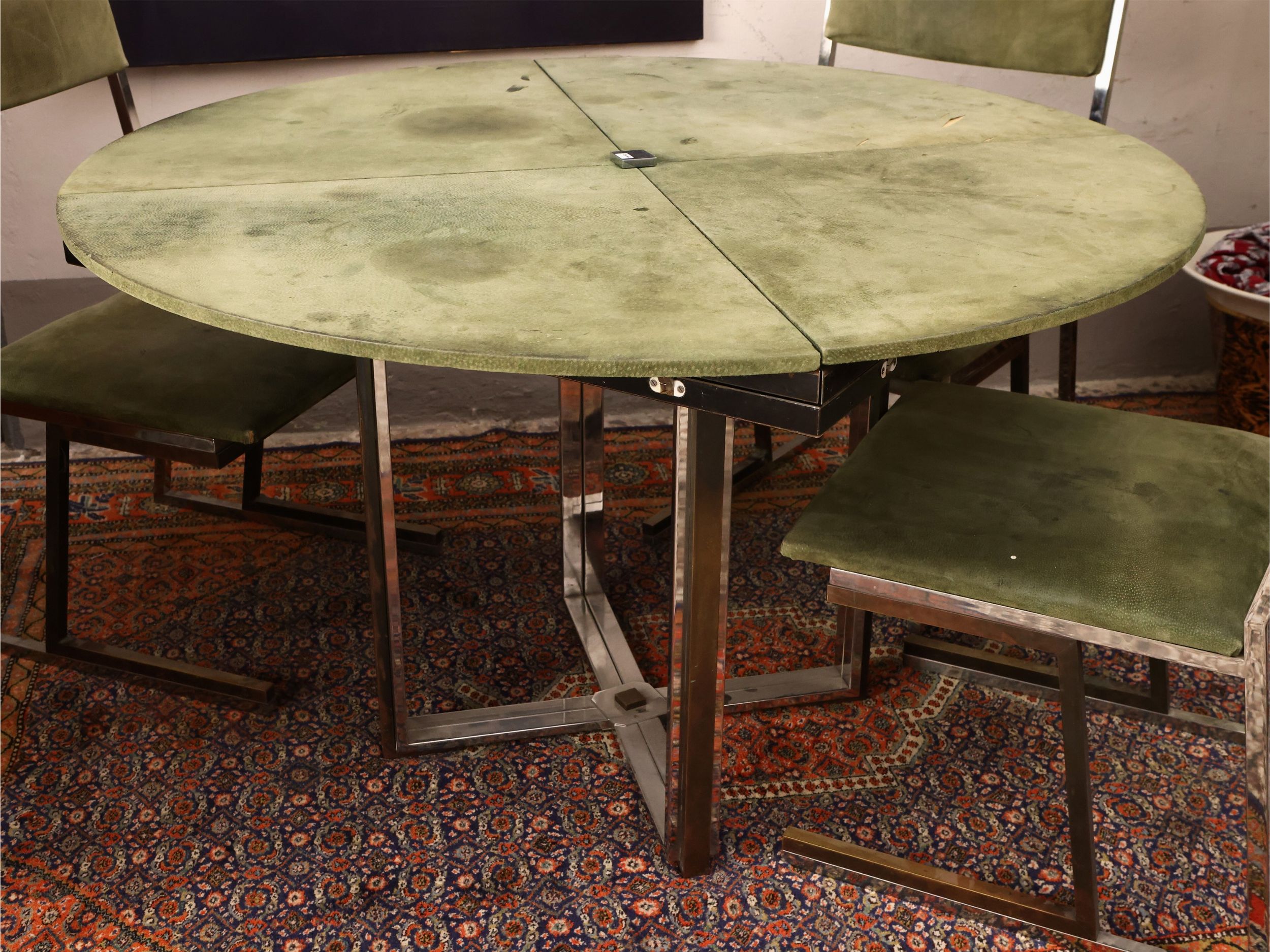 h cm da 69 a cm 73,5, piano diam cm 120, cm 120x120 Italia, Anni Settanta piano circolare rivestito in pelle di camoscio color verde, possibilità di trasformarsi in un piano di forma quadrangolare in legno laminato nero, sostegno realizzato in acciaio cromato con profilature in ottone, difetti