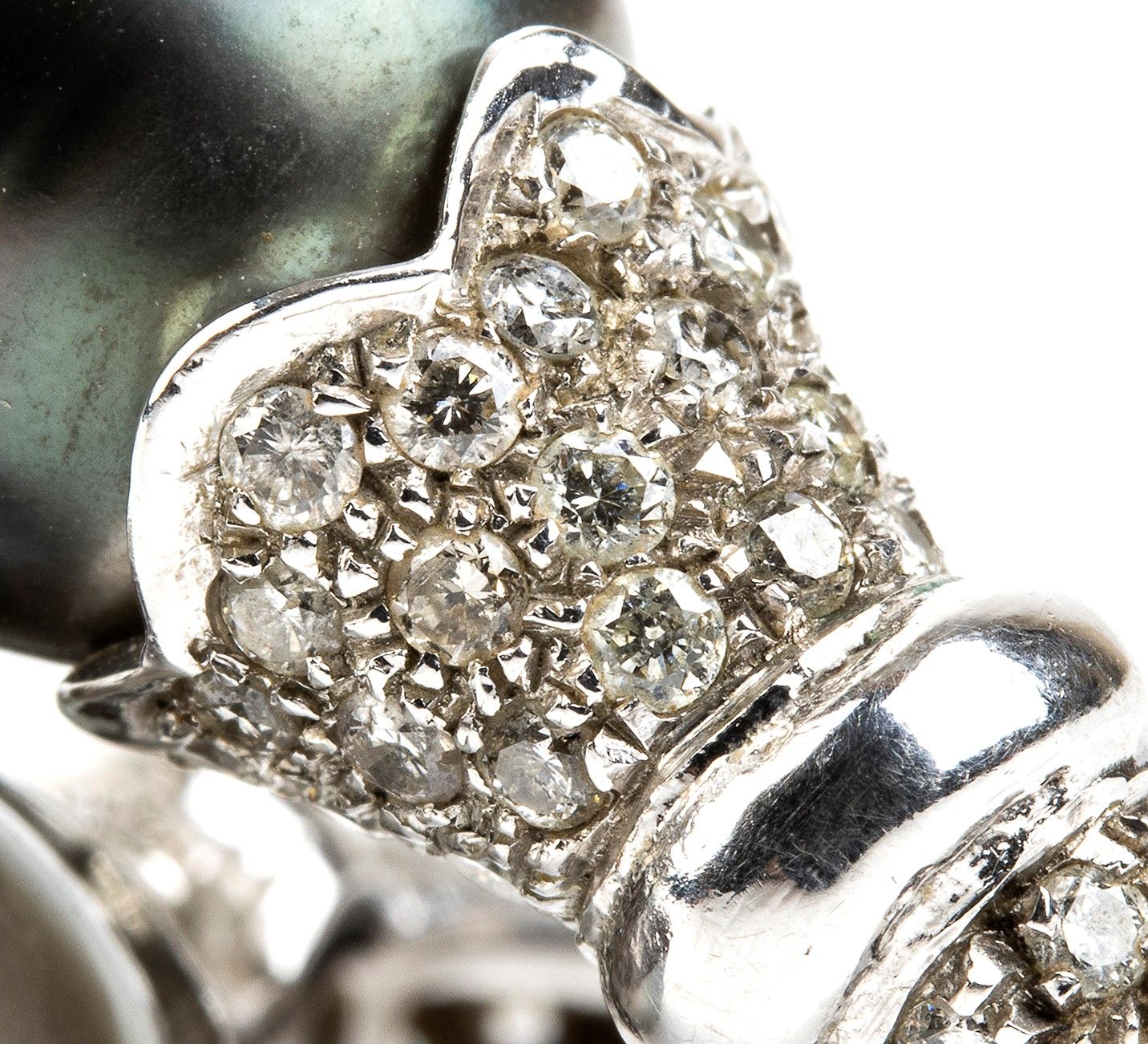 oro bianco 18k, con coppia di perle Tahiti affiancate da pave' di diamanti. Diamanti di forma rotonda, taglio brillante 1.10 ct circa, G-H , VS-SI. Punzonato 750.