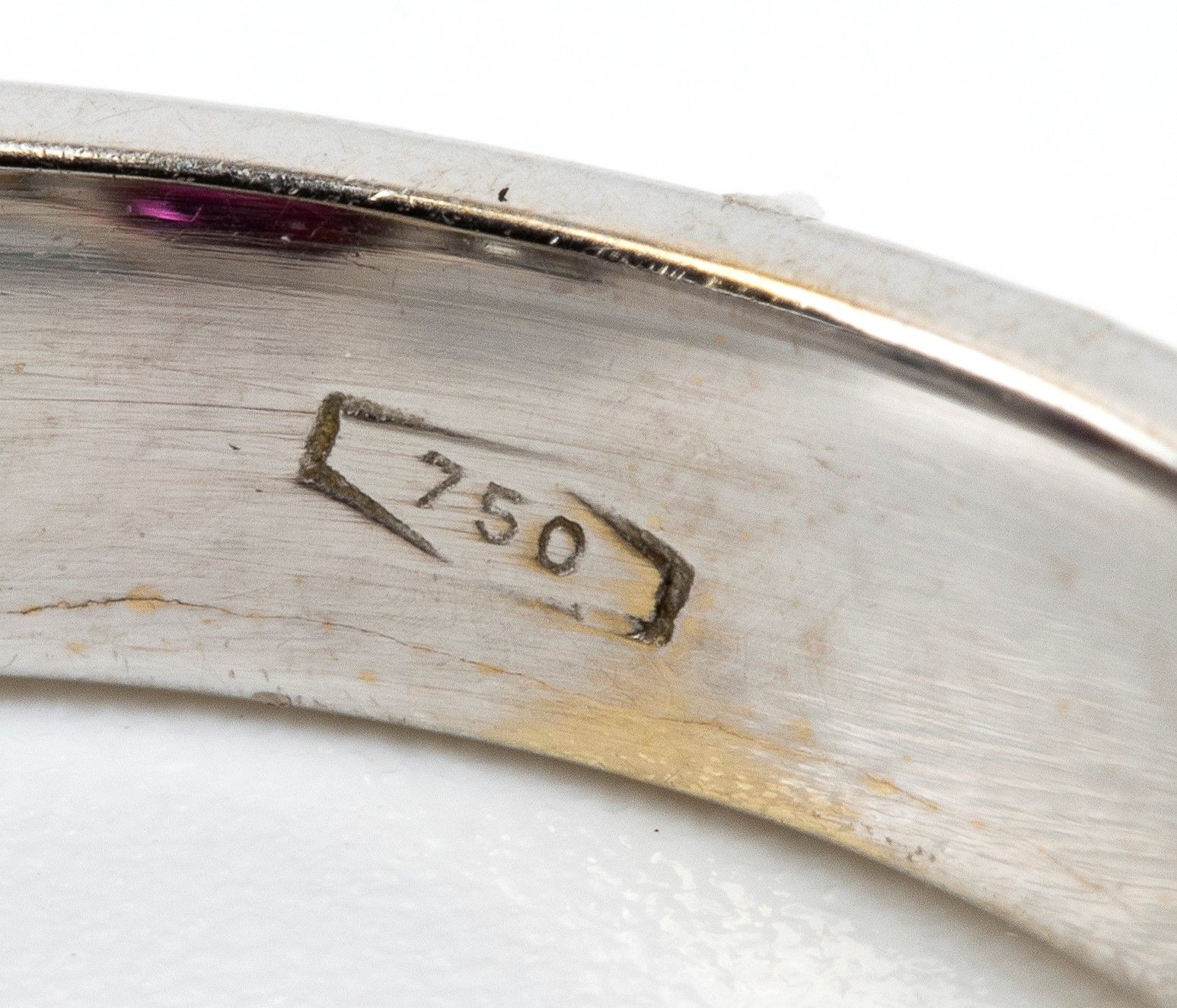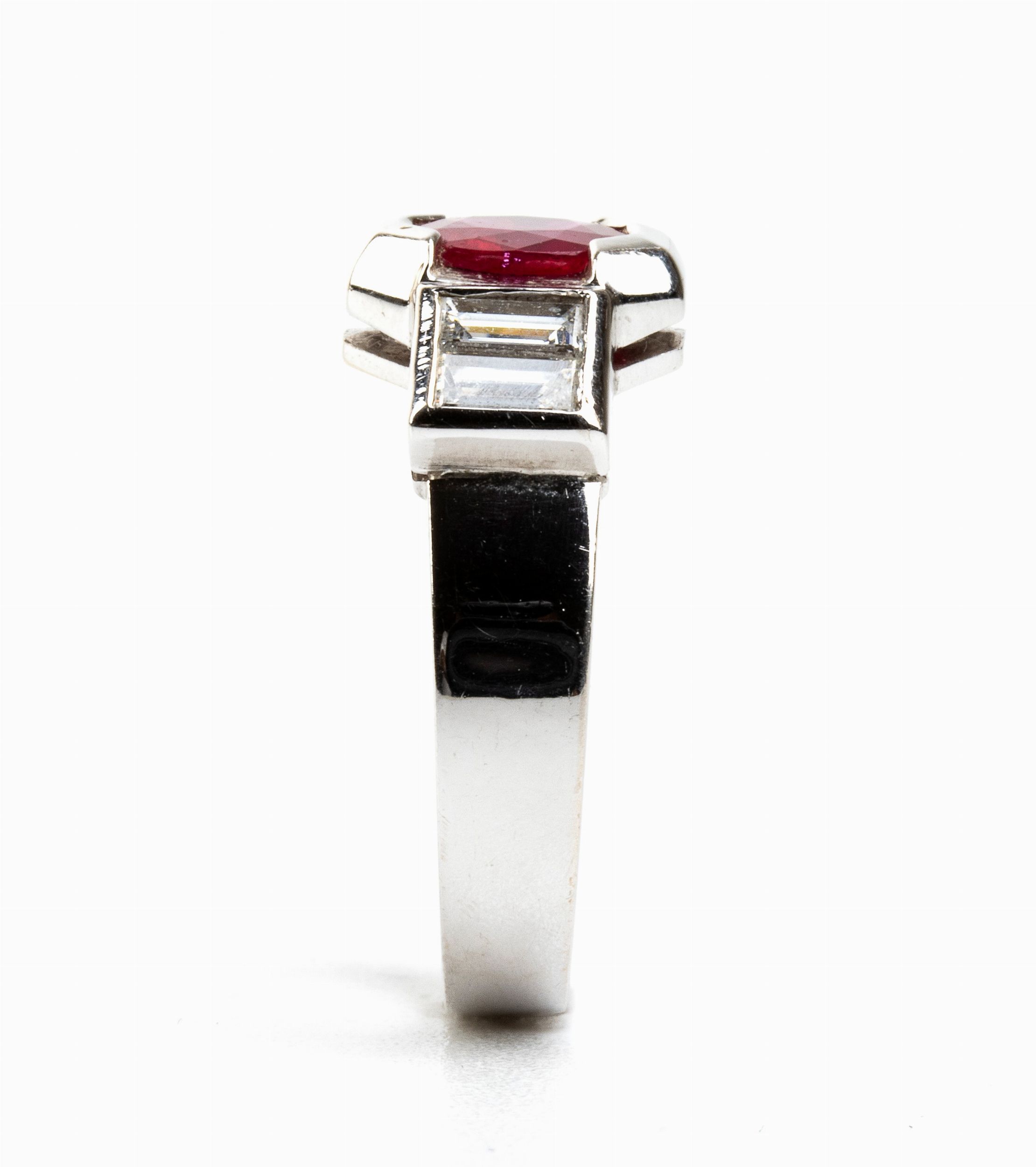 oro bianco 18k, incastonato con rubino affiancato da coppia di diamanti. N. 01 rubino di forma ovale, taglio composito, 1.20 ct circa. N. 04 diamanti di forma rettangolare, taglio a gradini, 0.60 ct circa, F - G, VVS. Punzonato 750.