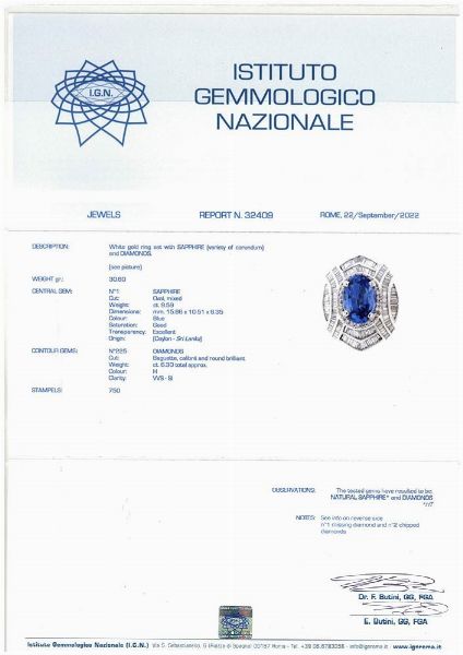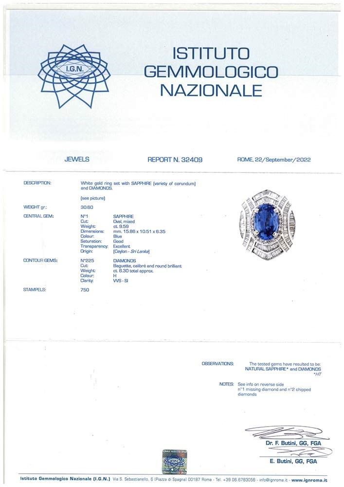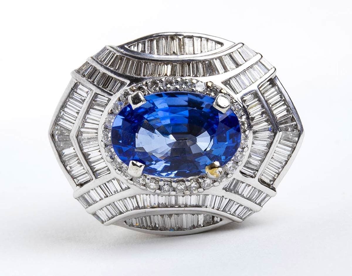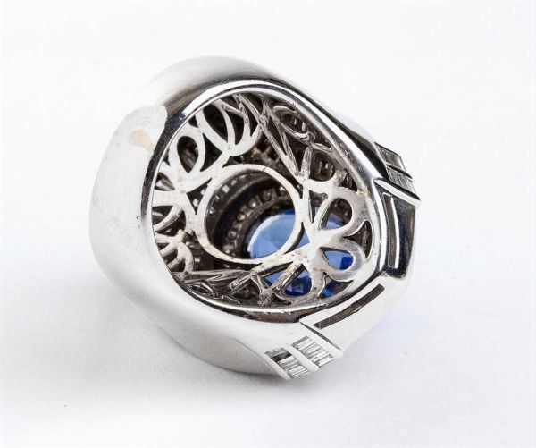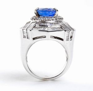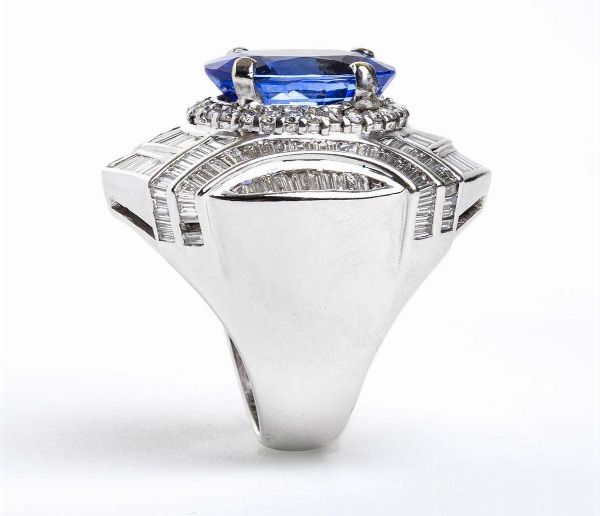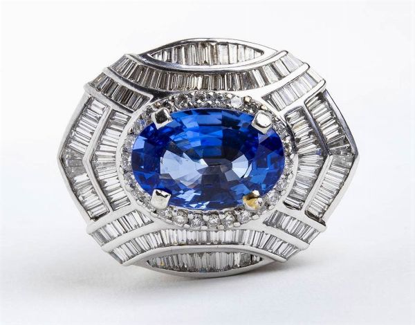 oro bianco 18k, incastonato con zaffiro ovale 9,63 ct circa incorniciato da diamanti rotondi taglio brillante, da nastri in diamanti taglio baguette e taglio tapered 6,63 ct circa, E-F, VVS-VS. Punzonato 750.