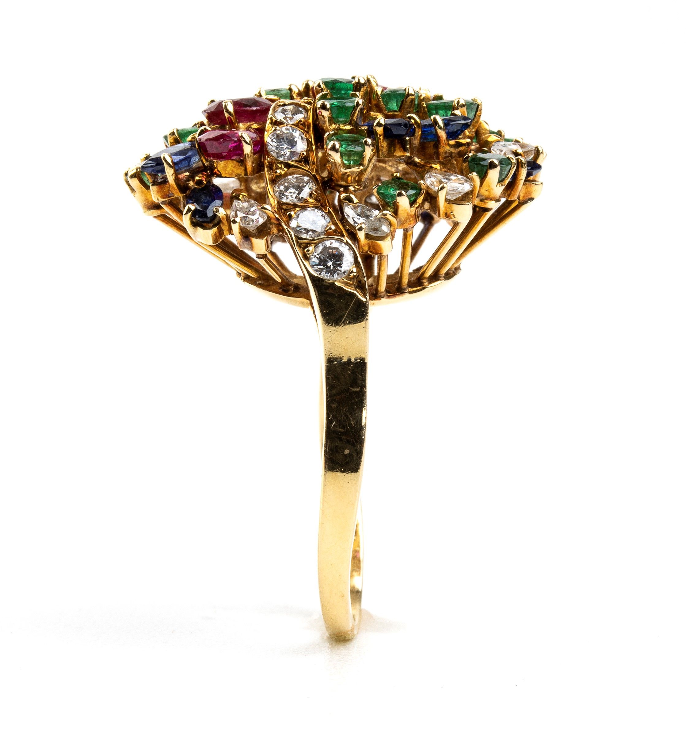 motivo floreale incastonato con diamanti di forma a navetta, taglio brillante modificato, 1.60 ct circa, G - H, VVS; rubini di forma a goccia, taglio composito, 1.50 ct circa; smeraldi di forma rotonda, taglio composito, 1.30 ct circa. Misura IT 19 - Misura US 9. peso 10 gr. Stato di conservazione: **** buono.