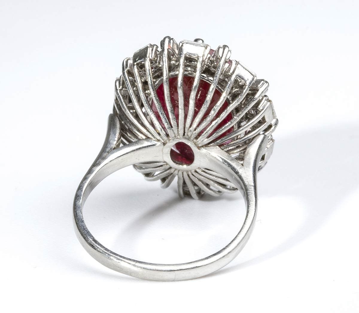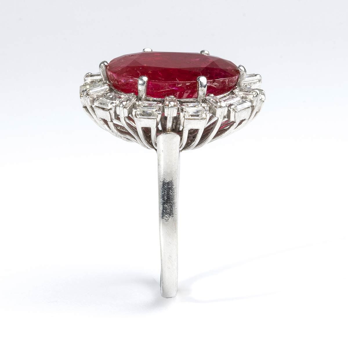 incastonato con rubino contornato da diamanti. Rubino di forma rotonda taglio composito 10.00 ct circa. Diamanti di forma rettangolare taglio a gradini 2.00 ct circa, E-F, VVS.