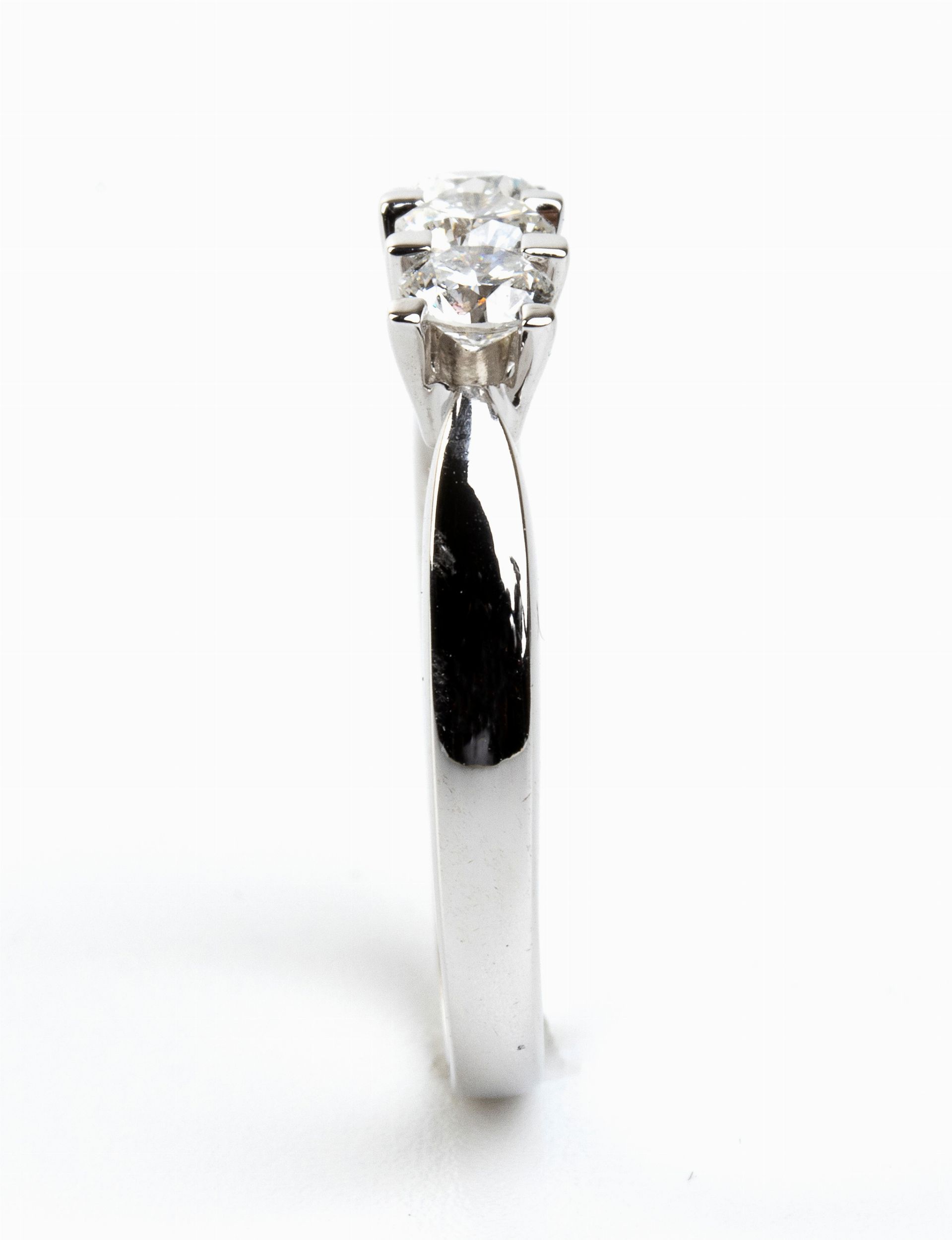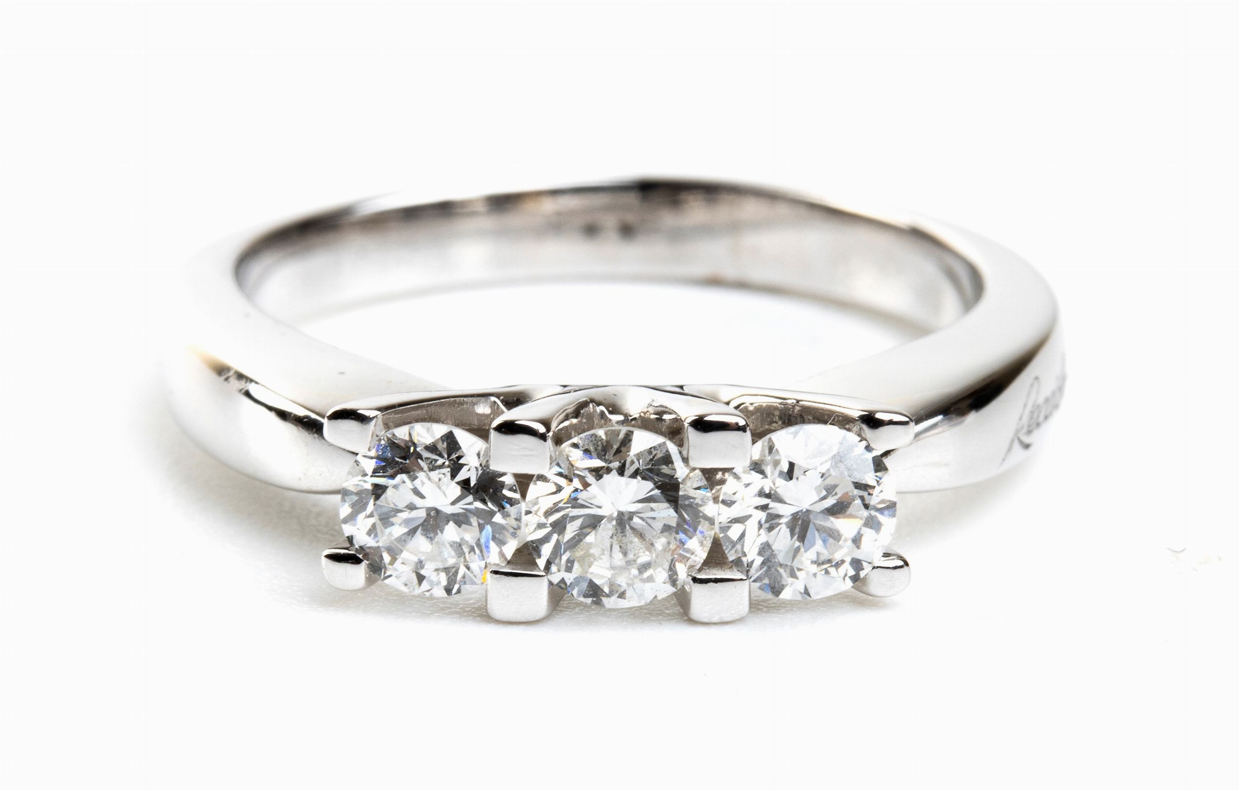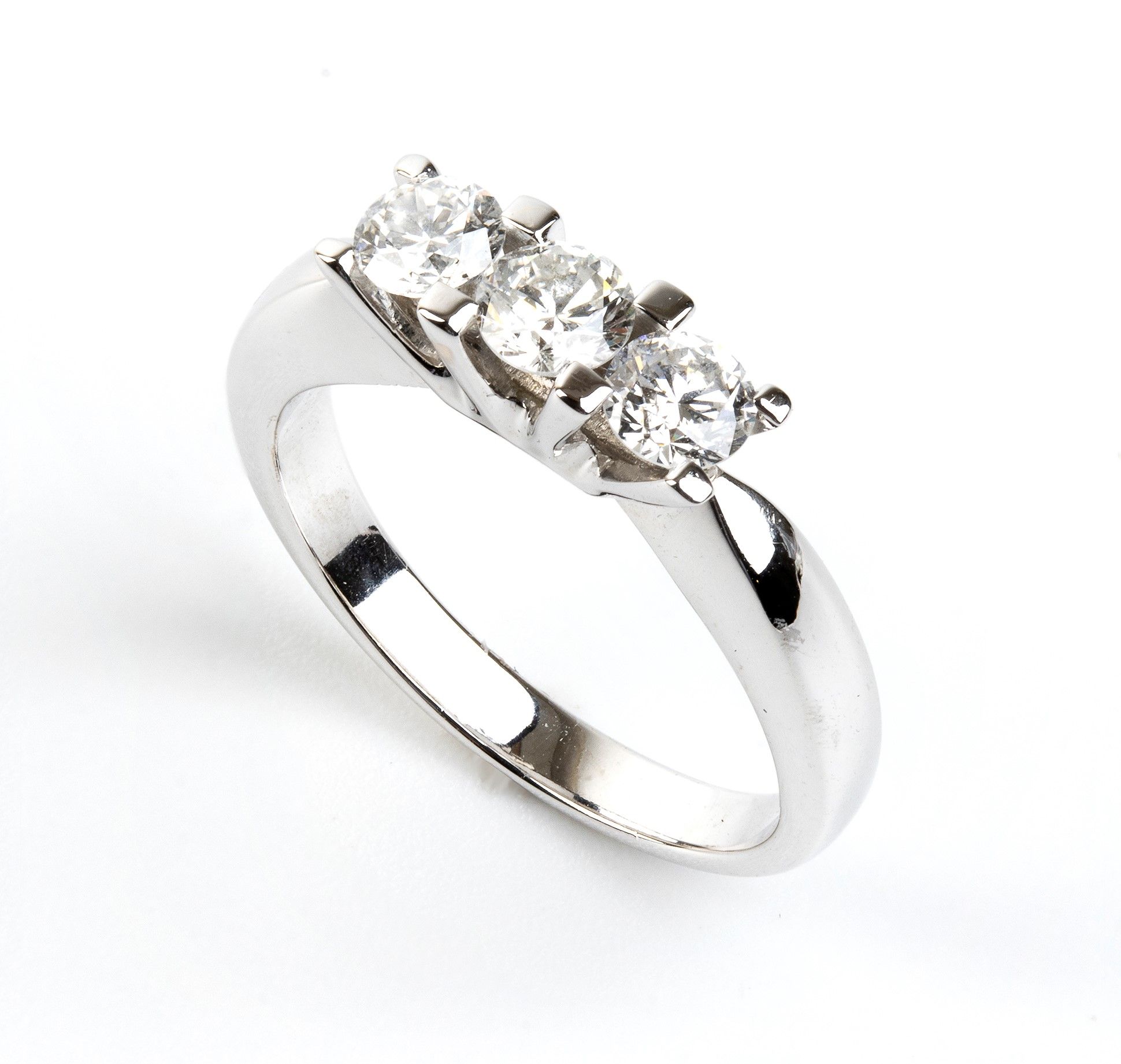oro bianco 18k, incastonato con tre diamanti. N. 03 diamanti di forma rotonda taglio brillante 0.60 ct circa, F-G, VS-SI. Punzonato 750 - 1845 AL - MADE IN ITALY.