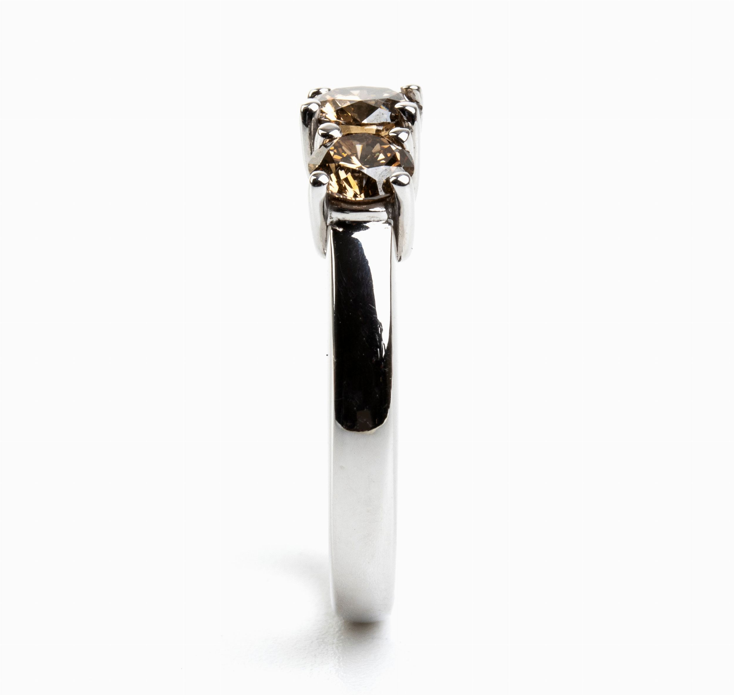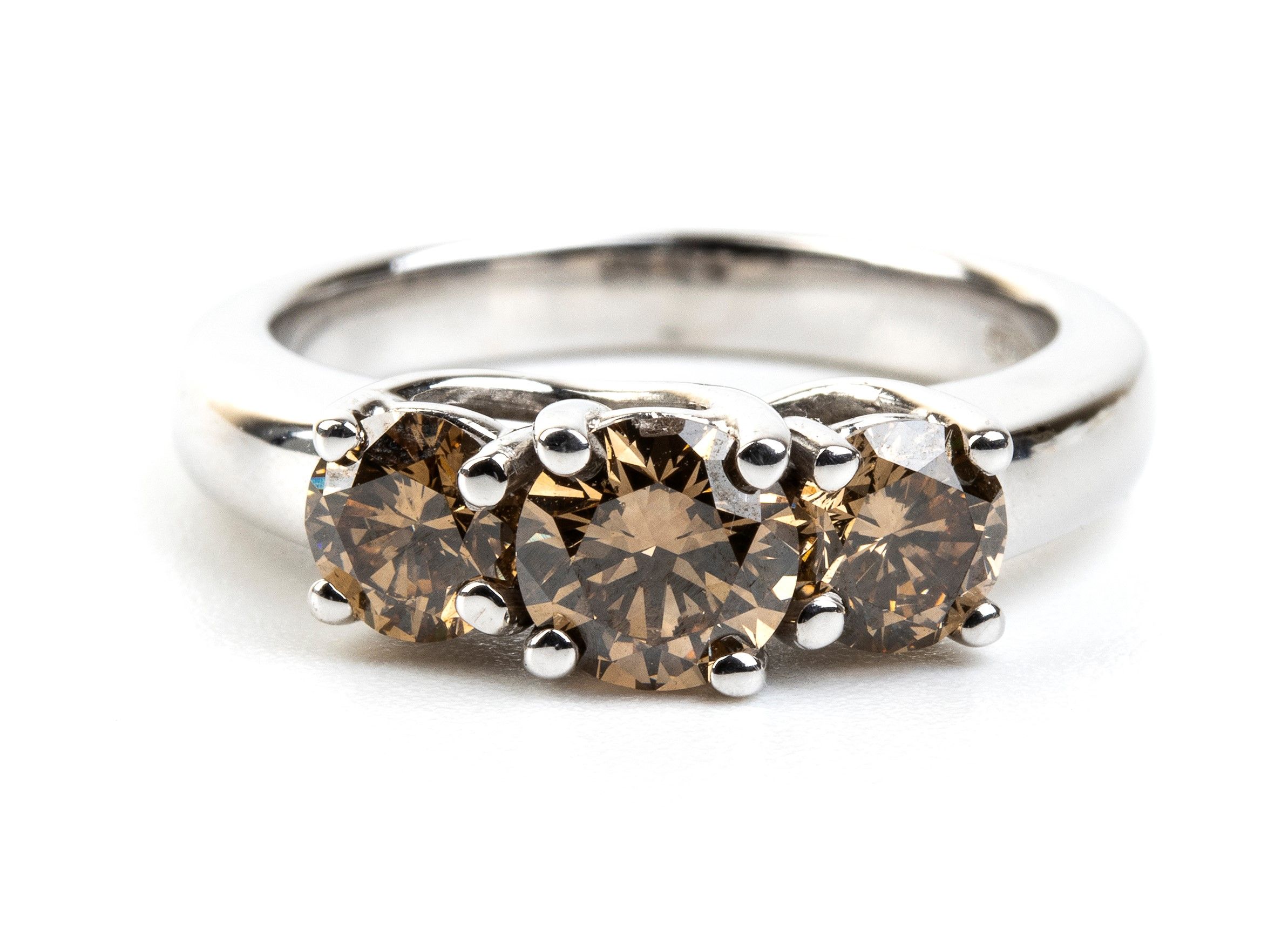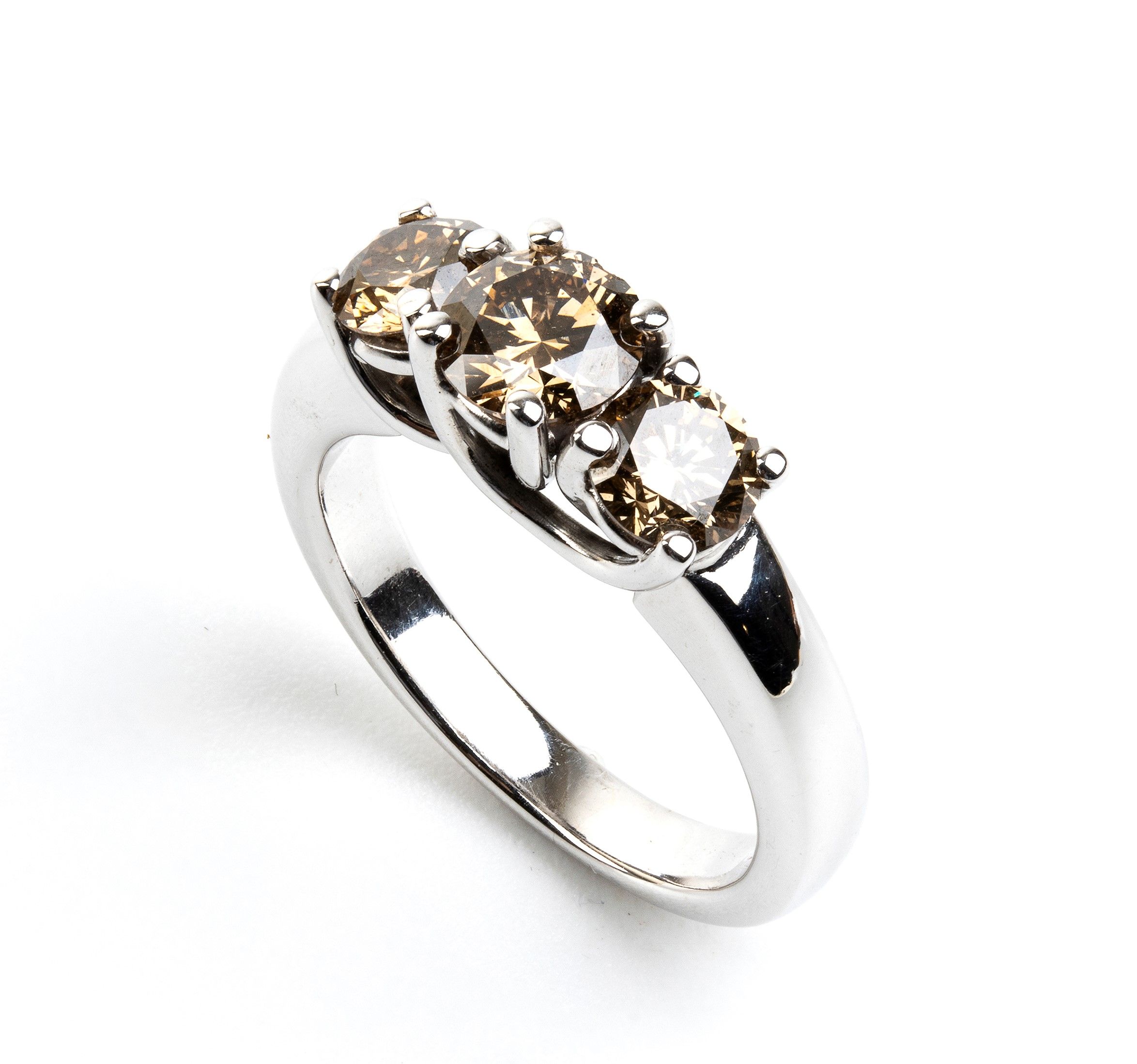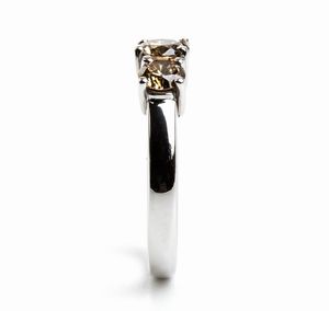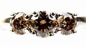 oro bianco 18k, incastonato con tre diamanti colore fantasia brown. N. 03 diamanti di forma rotonda taglio brillante 1.70 ct circa, colore fantasia marrone. Punzonato 750.