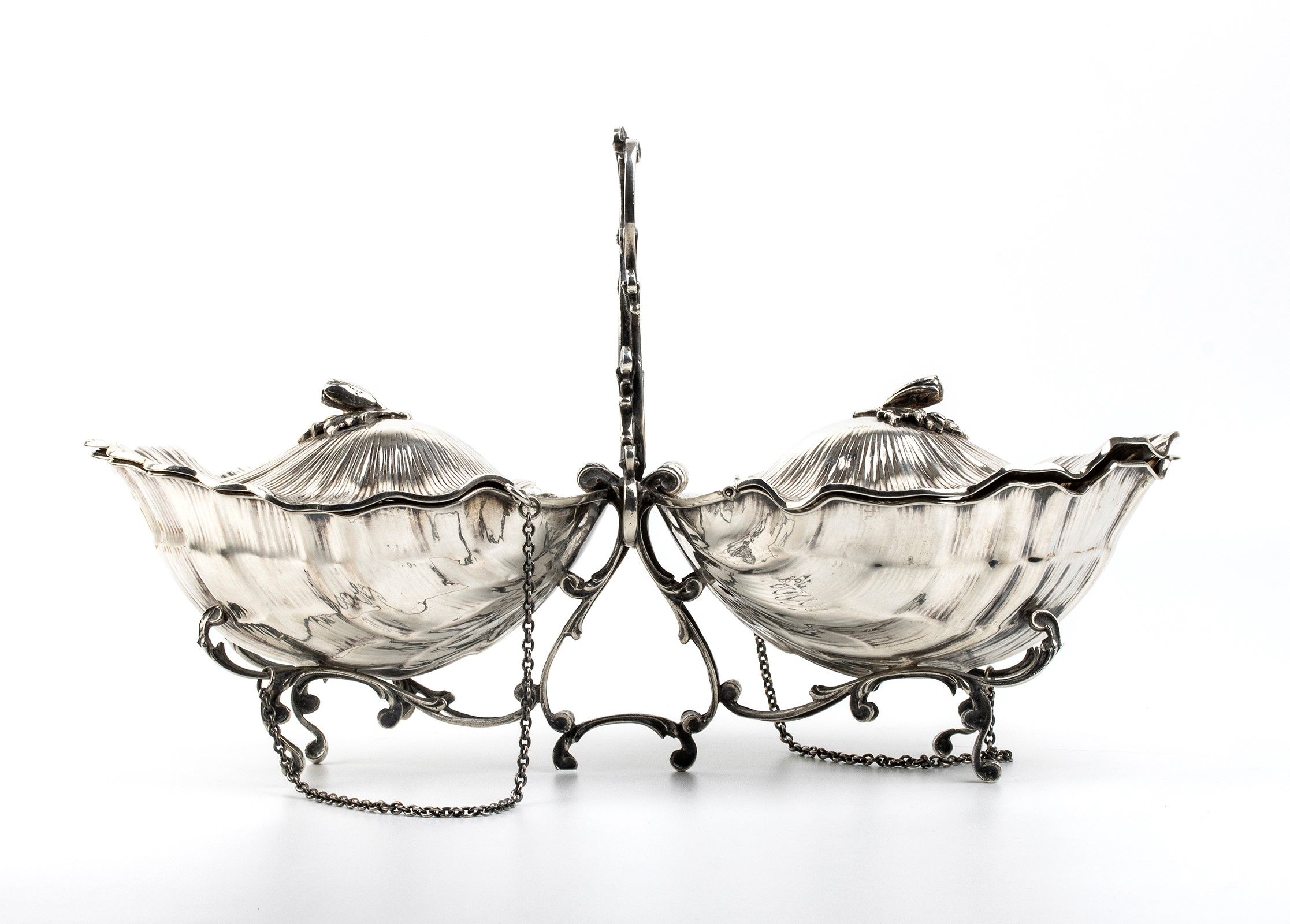 di forma sagomata con due contenitori laterali, coperchi incernierati a forma di foglia.