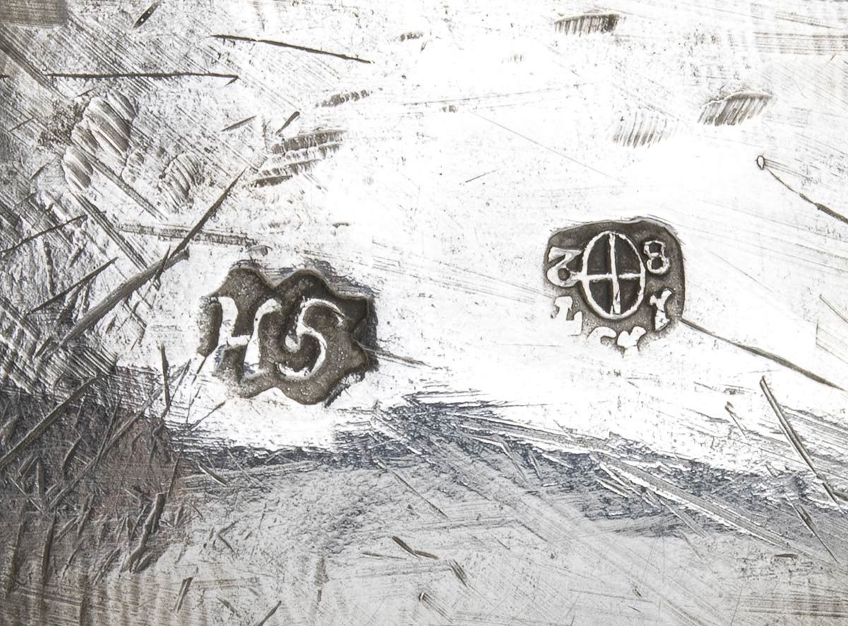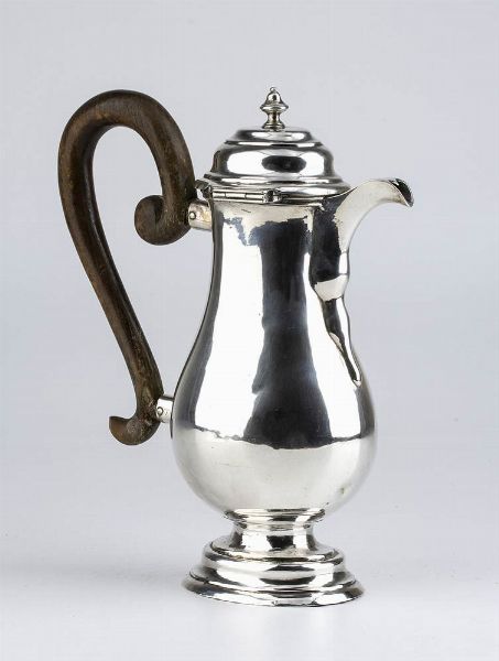 di forma ovale con pide alto gradinato, corpo liscio con coperchio duomato gradinato incernierato sul lato lungo; manico ligno a doppia voluta. Punzonata con i marchi in uso a Vienna nel 1782 per l'argento al titolo di 13 lothige /812/1000), argentiere FR.
