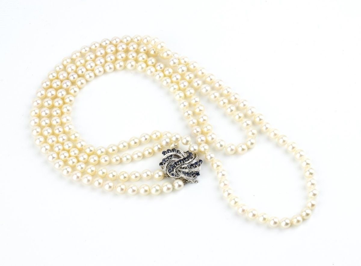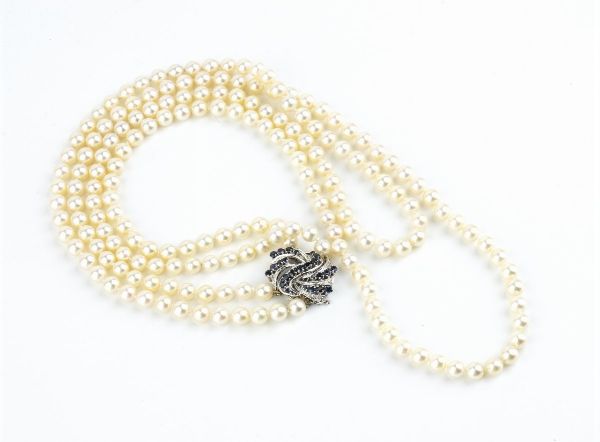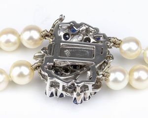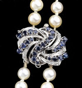 due fili di perle coltivate d'acqua salata con fermezza a motivo di girali in oro bianco 18k e zaffiri. N. 25 zaffiri di forma rotonda taglio composito 2.20 ct circa. Punzonato 750.
