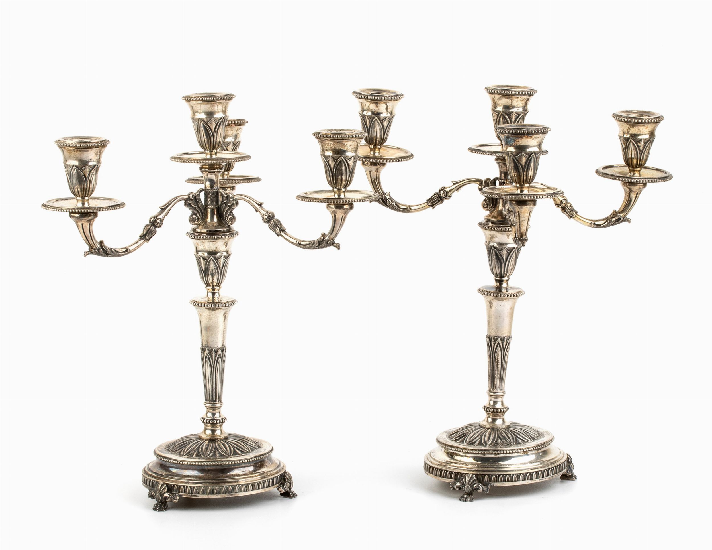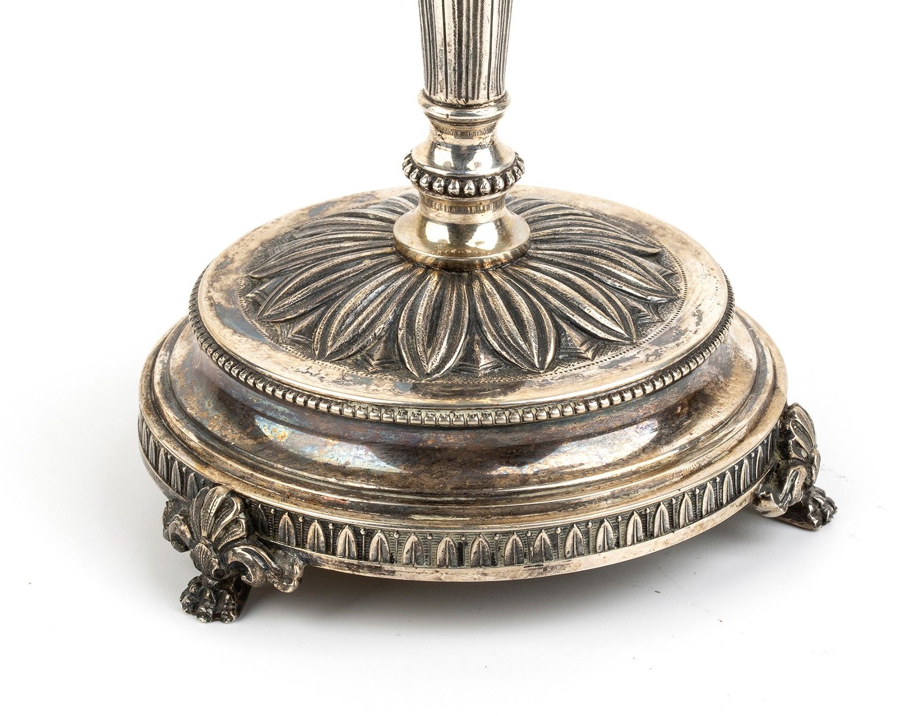 base di forma circolare decorata a palmette, parte superiore a quattro. Argento 800/1000, punzonati con marchi di epoca fascista in uso dal 1935 al 1945. Diametro base x altezza: 10,5 x 29,5 cm. Peso complessivo 1660 gr. Stato di conservazione: **** buono.