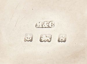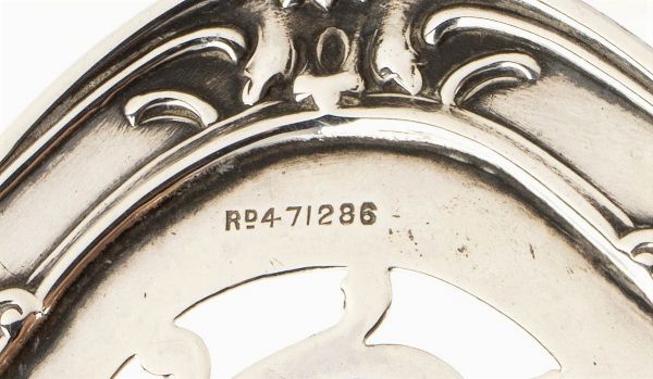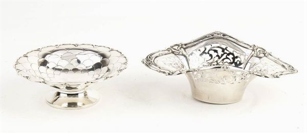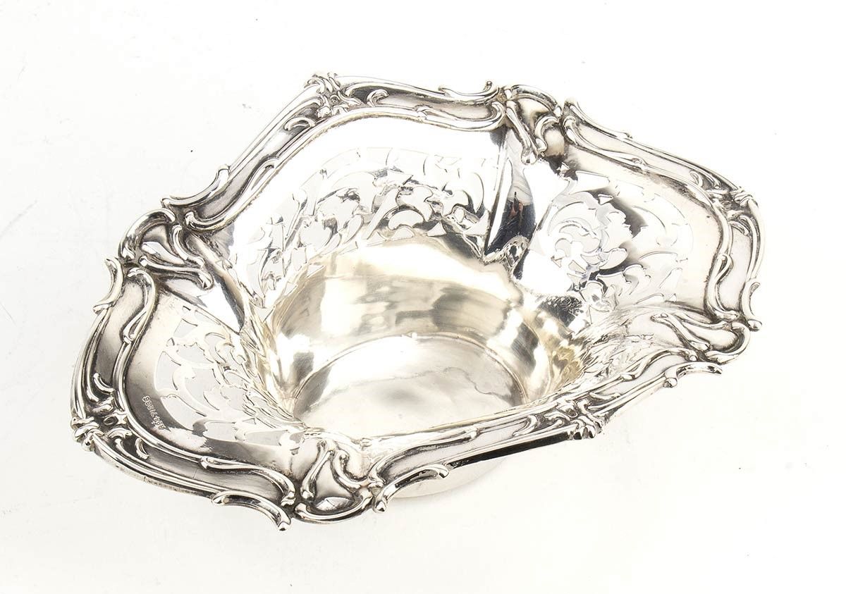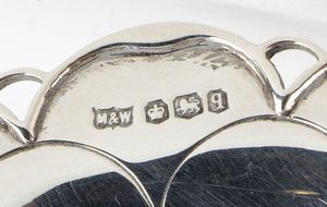 1) di forma ovale sagomata decorato e traforato a volute vegetali. Argento 925/1000, serie completa di marchi Birmingham 1906-1907, argentieri G. M. Milicham & Co. Altezza x larghezza x profondità : 6 x 17,5 x 11,2 cm, peso 102 gr.