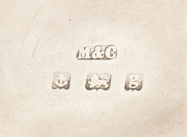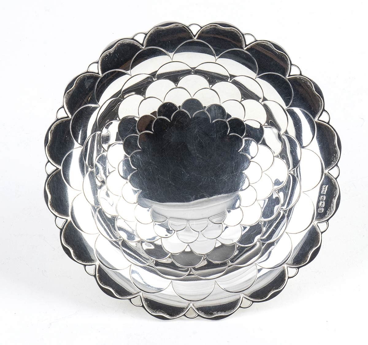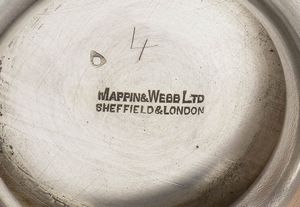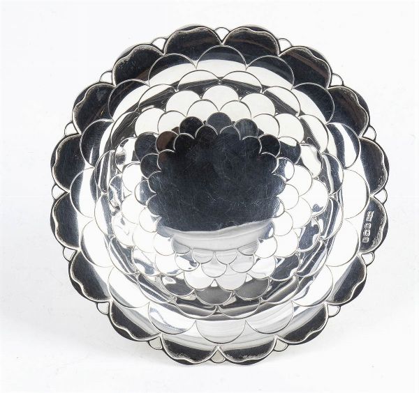 2) di forma rotona decorato a scuame di pesce. Argento 925/1000, serie completa di marchi Sheffield 1933-1934, argentieri Mappin & Webb. Diametro 12,5 cm, altezza 4,5 cm, peso 81 gr.