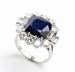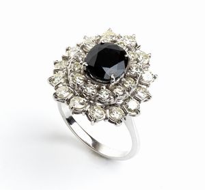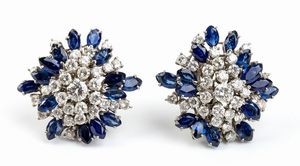 incastonato con zaffiro tra doppia cornice di diamanti. N. 26 diamanti di forma rotonda, taglio brillante, 2.10 [..]