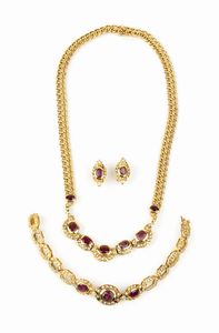 Paio di orecchini e girocollo a dieci fili in oro, corallo rosa e diamanti