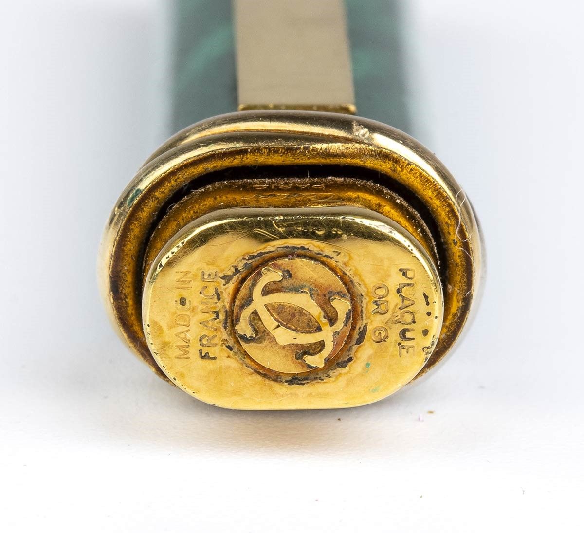 fusto e cappuccio in lacca verde placcati in oro; premendo la parte superiore del cappuccio la clip si apre alla larghezza desiderata e rilasciando la pressione la clip ritorna nella sua posizione originale. Numero di serie 685754.