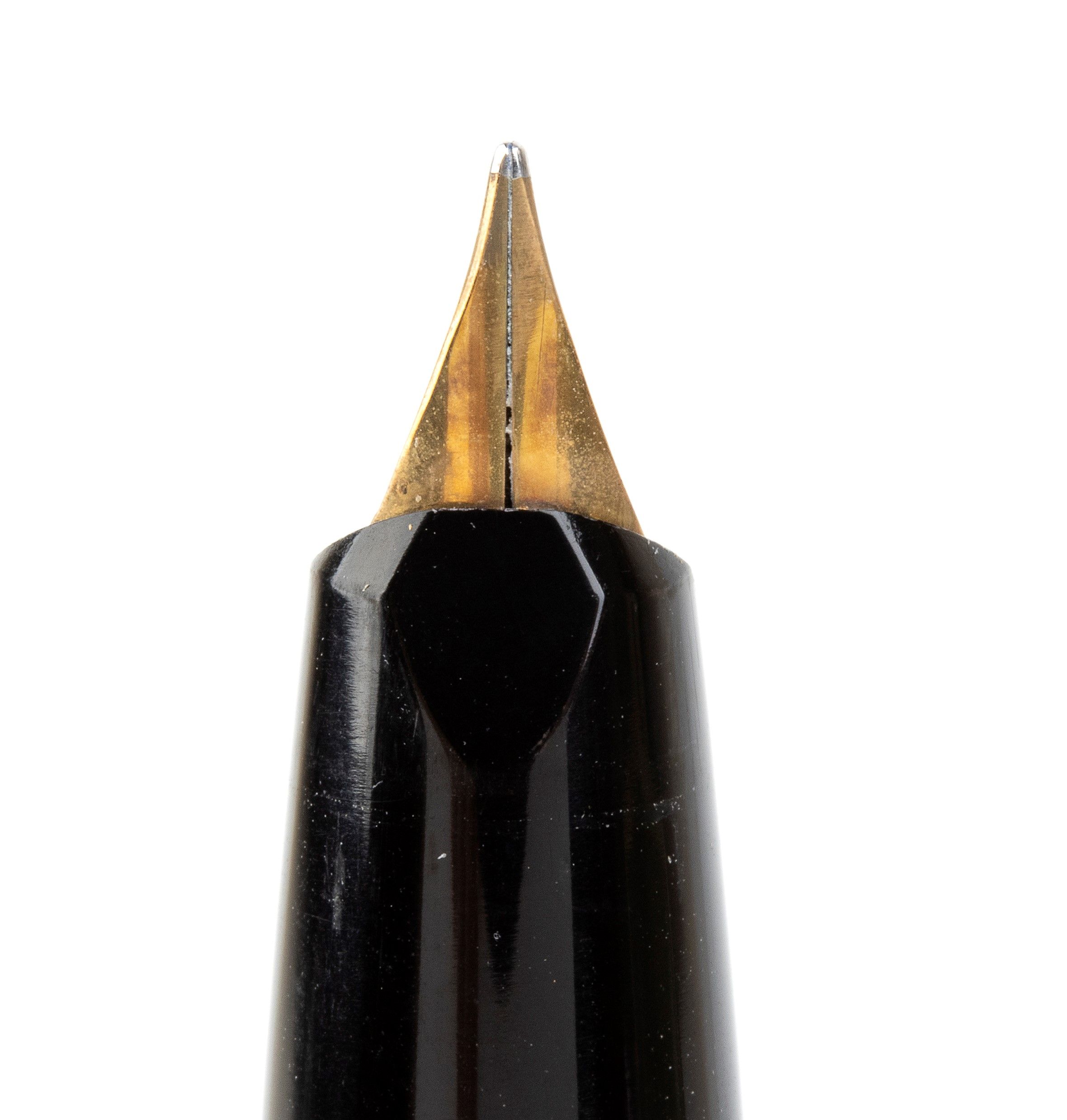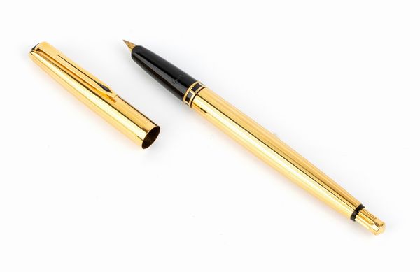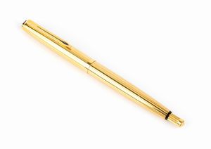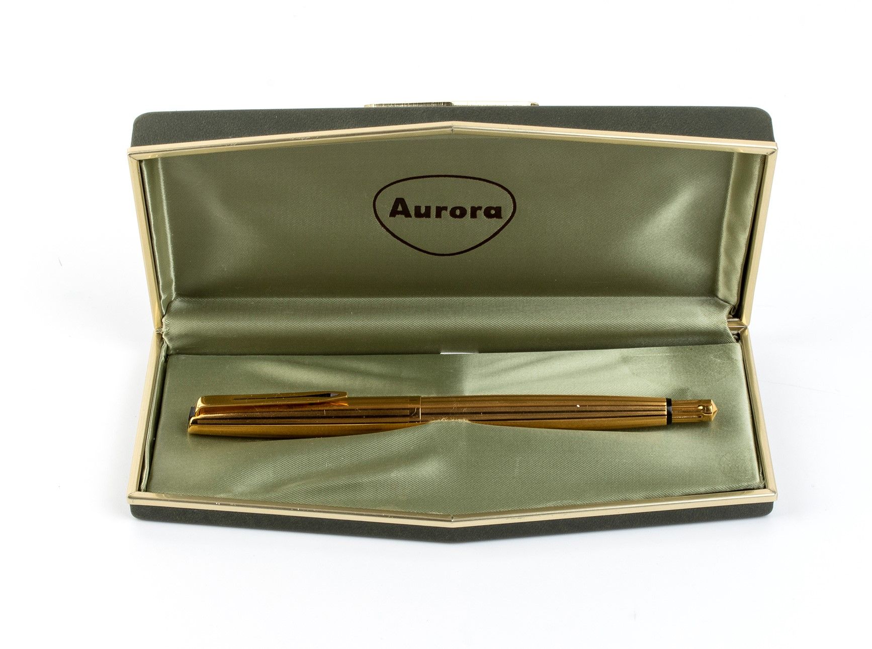 c) una penna stilografica AURORA in custodia originale, sistema di caricamento a stantuffo. Lunghezza 13,8 cm. Peso 21,6 gr.