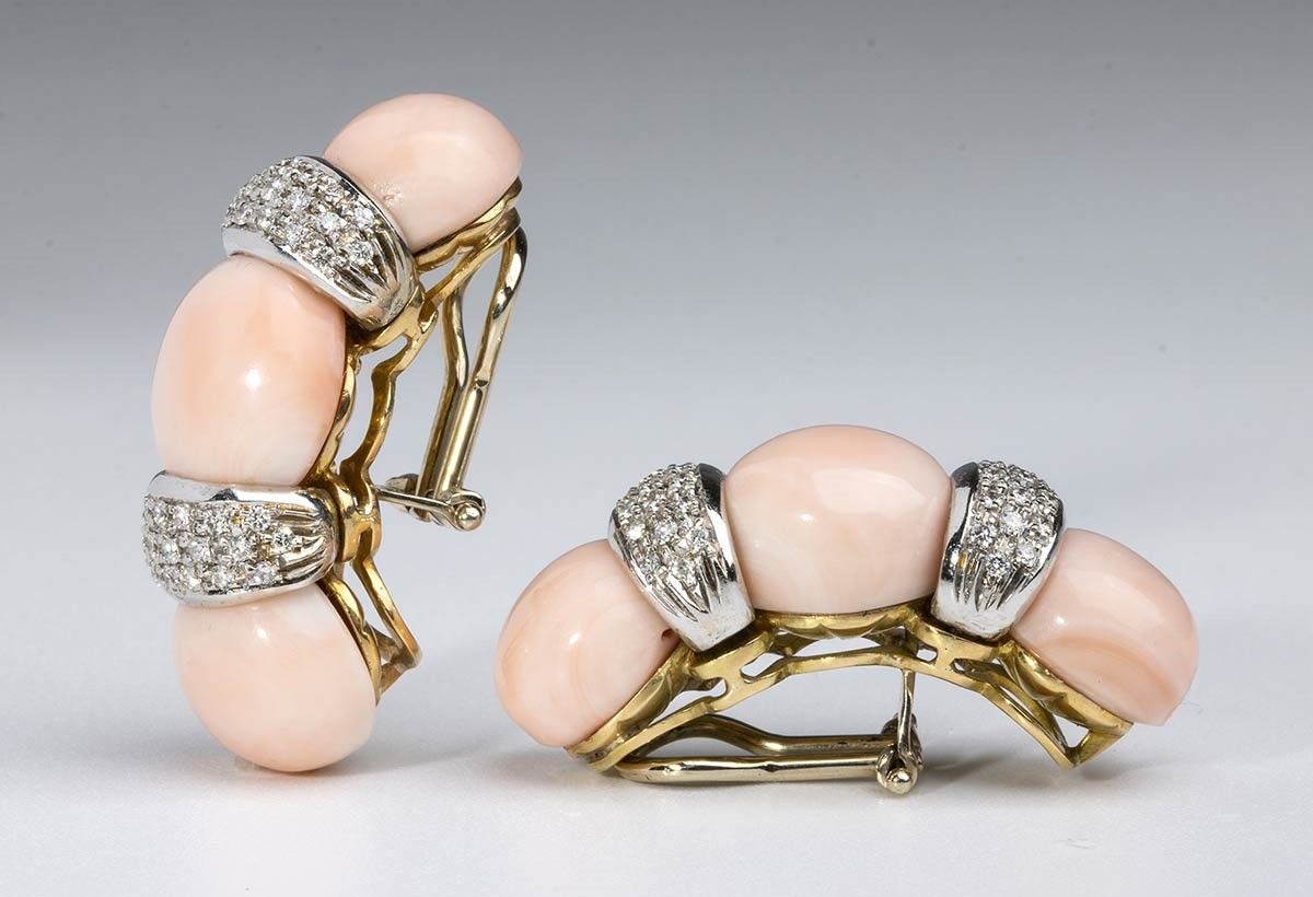 oro bianco 18k, ciascuno con tre cabochon di corallo rosa (corallium deep sea) separati da pavè di diamanti.
