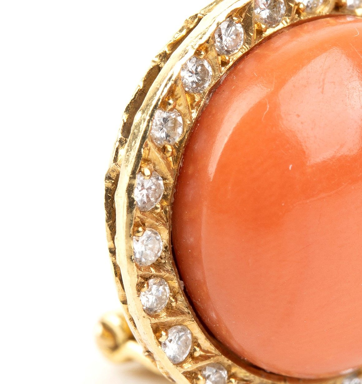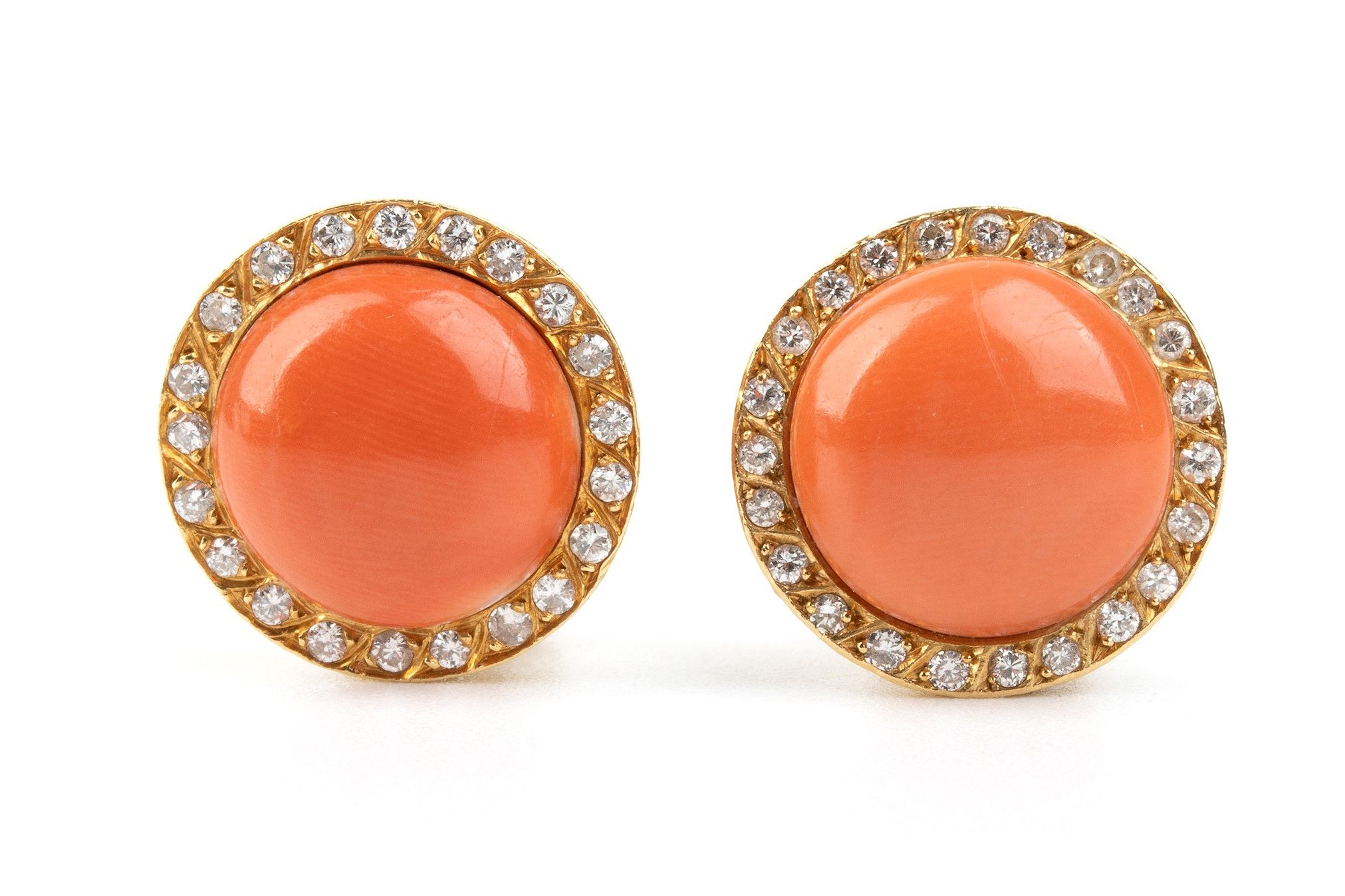 incastonati con cabochon di corallo cerasuolo (corallim elatius) incorniciato da diamanti. 42 diamanti di forma rotonda, taglio brillante, 0.60 ct circa, G - H, VVS.