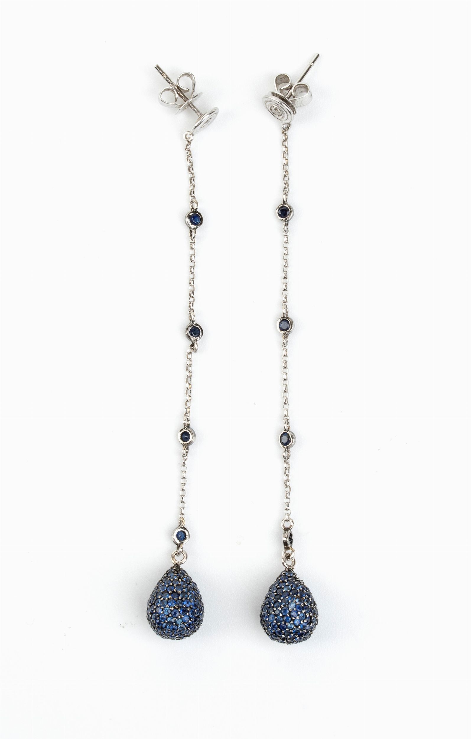 oro bianco 18k, con goccia pendente in pavè di zaffiri. N. 02 diamanti di forma rotonda taglio brillante 0.06 ct circa. Zaffiri di forma rotonda taglio composito 5.00 ct circa. Punzonato 750.