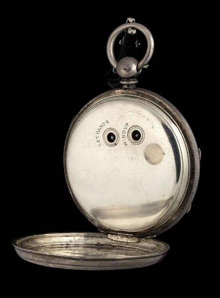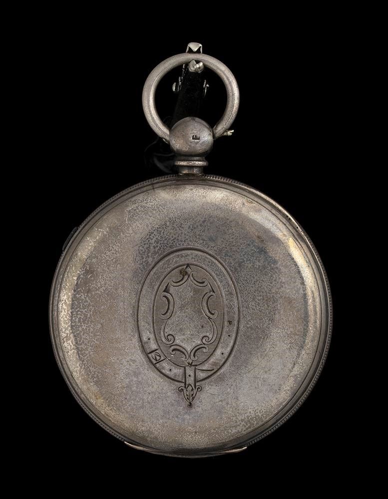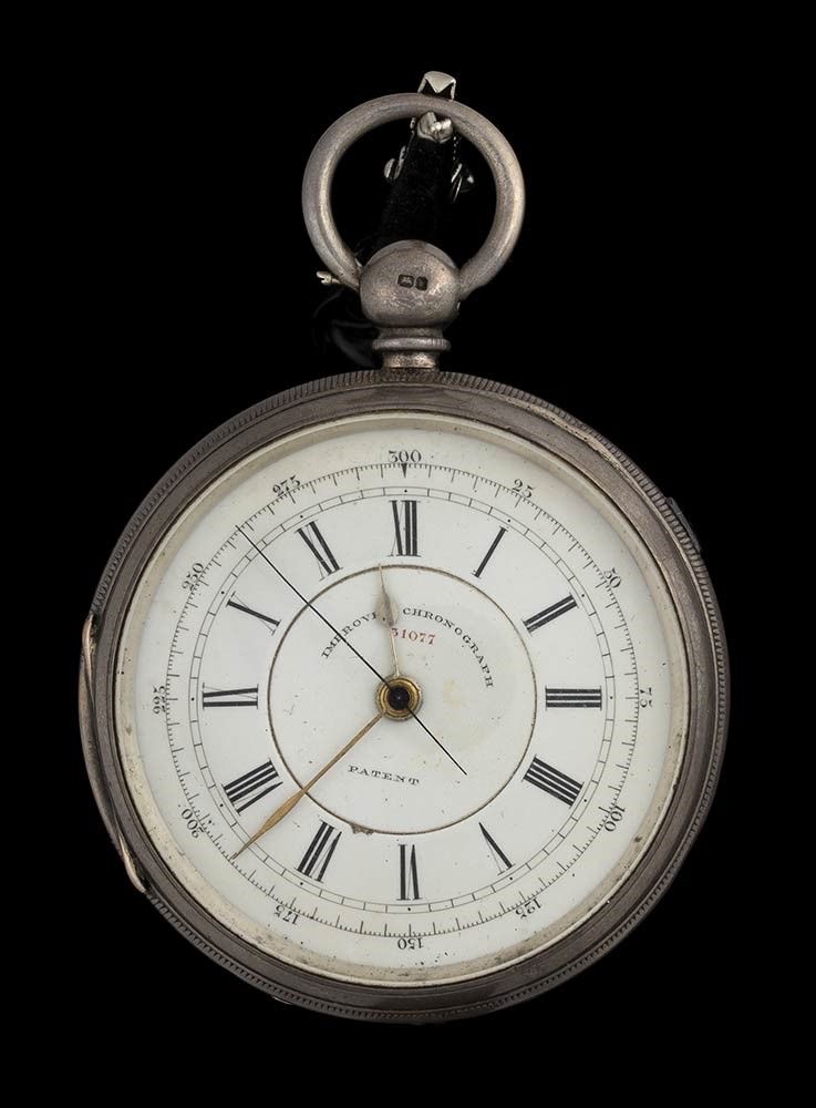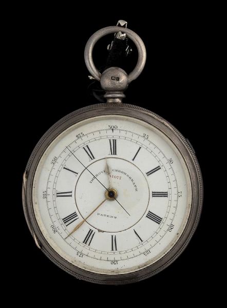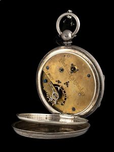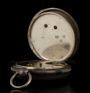 cassa in argento 925/1000 punzonata Chester 1878-79, quadrante in smalto bianco con numeri romani, cursore laterale per attivare e fermare il movimento. Rimessa dell'ora e carica a chiave. Diametro 58 mm.