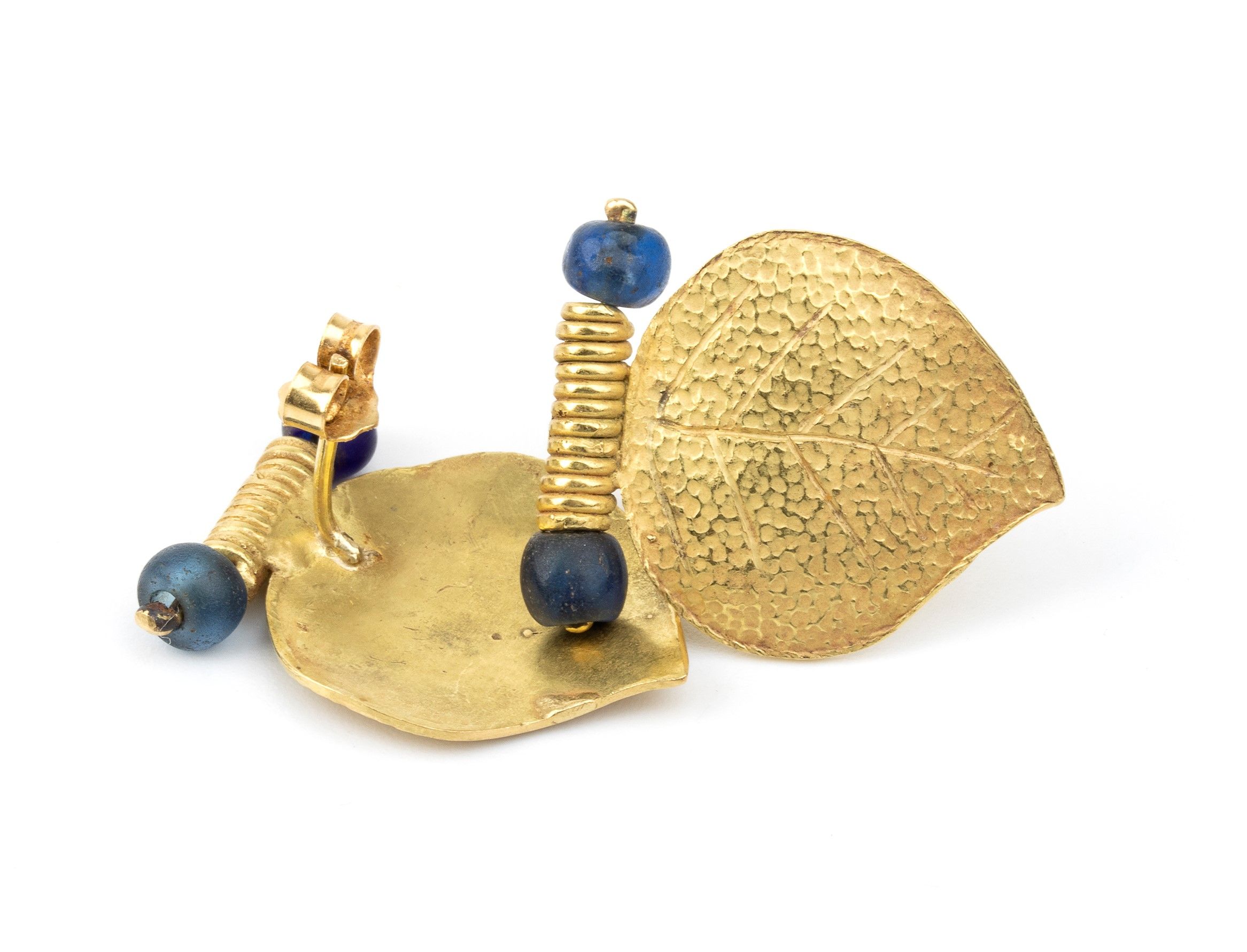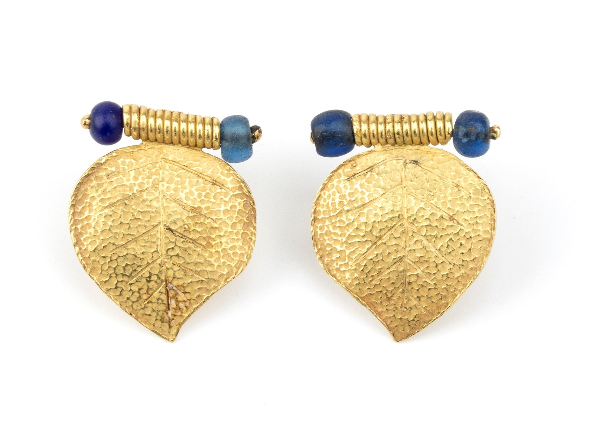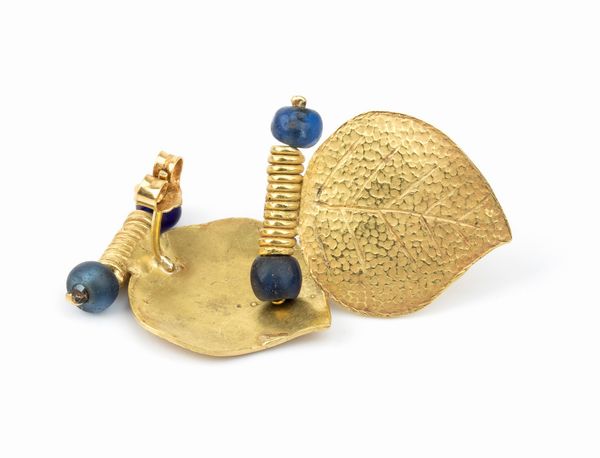oro giallo 18k, modellati a lastra con finitura martellata, ciascuno decorato con coppia di sfere di pasta vitrea blu. Punzonati 18k.
