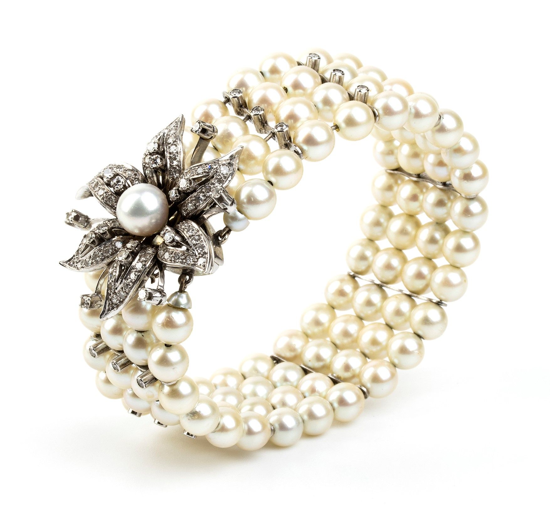 a quattro fili di perle coltivate d'acqua salata trattenute da distanziali a barretta con diamanti. Fermezza realizzata in oro bianco raffigurante un fiore con perla centrale e petali impreziositi da diamanti. Firmato SCORTECCI. Diamanti di forma rotonda, taglio huit-huit, 2.70 ct circa, G-H, VVS-SI.