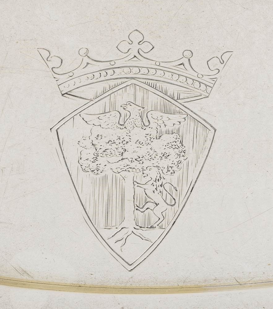 Dimensioni e pesi: vassoio, 39 x 30 cm, peso 779 gr; caffettiera, altezza 21 cm, larghezza con manico 24,5 cm, peso 701 gr; teiera, altezza 214 cm, larghezza con manico 24 cm, peso 533 gr; zuccheriera, altezza 9 cm, larghezza con manici 16 cm, peso 308 gr; bricco da latte, altezza 7 cm larghezza con manico 11,5 cm, peso 125 gr.
