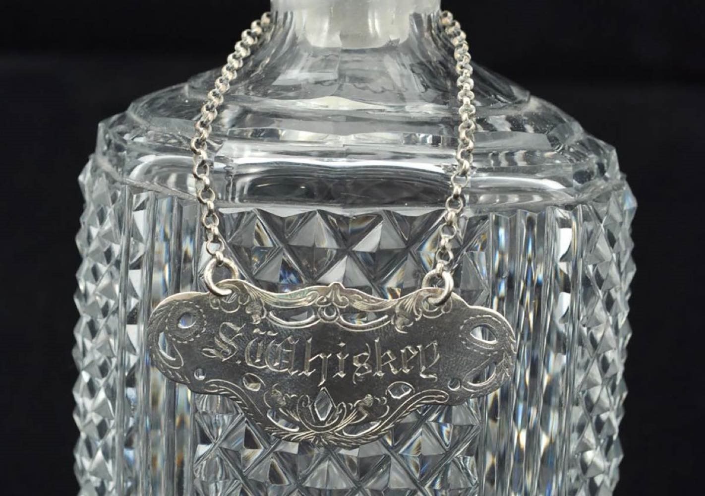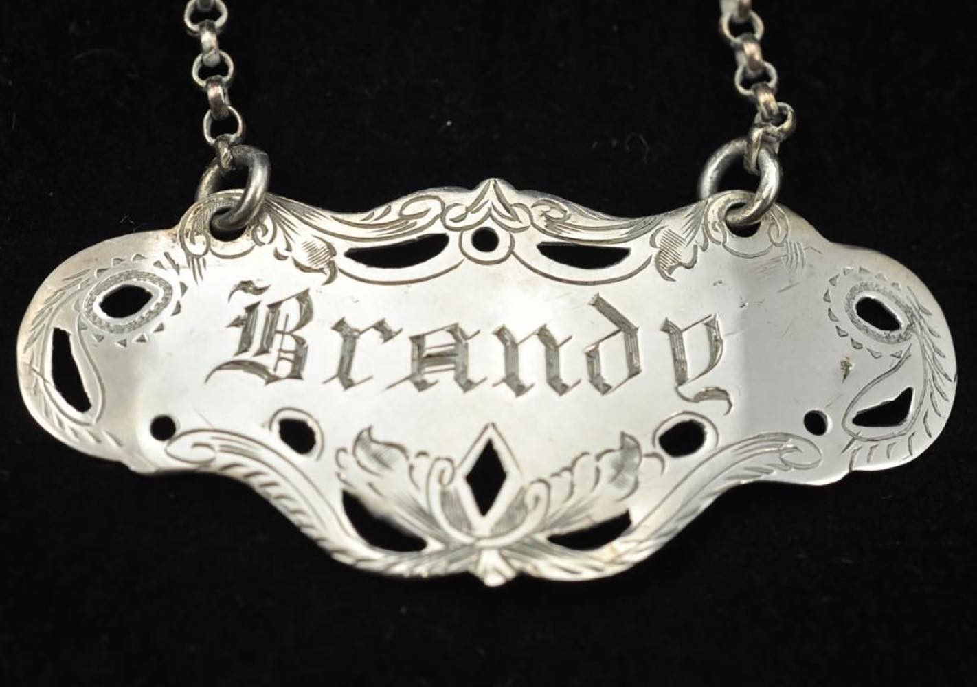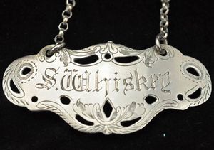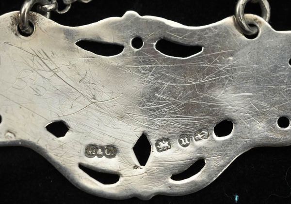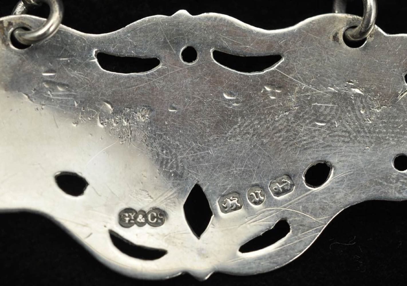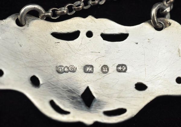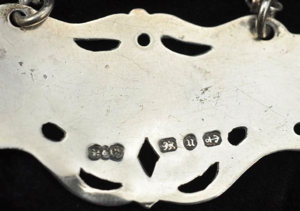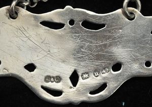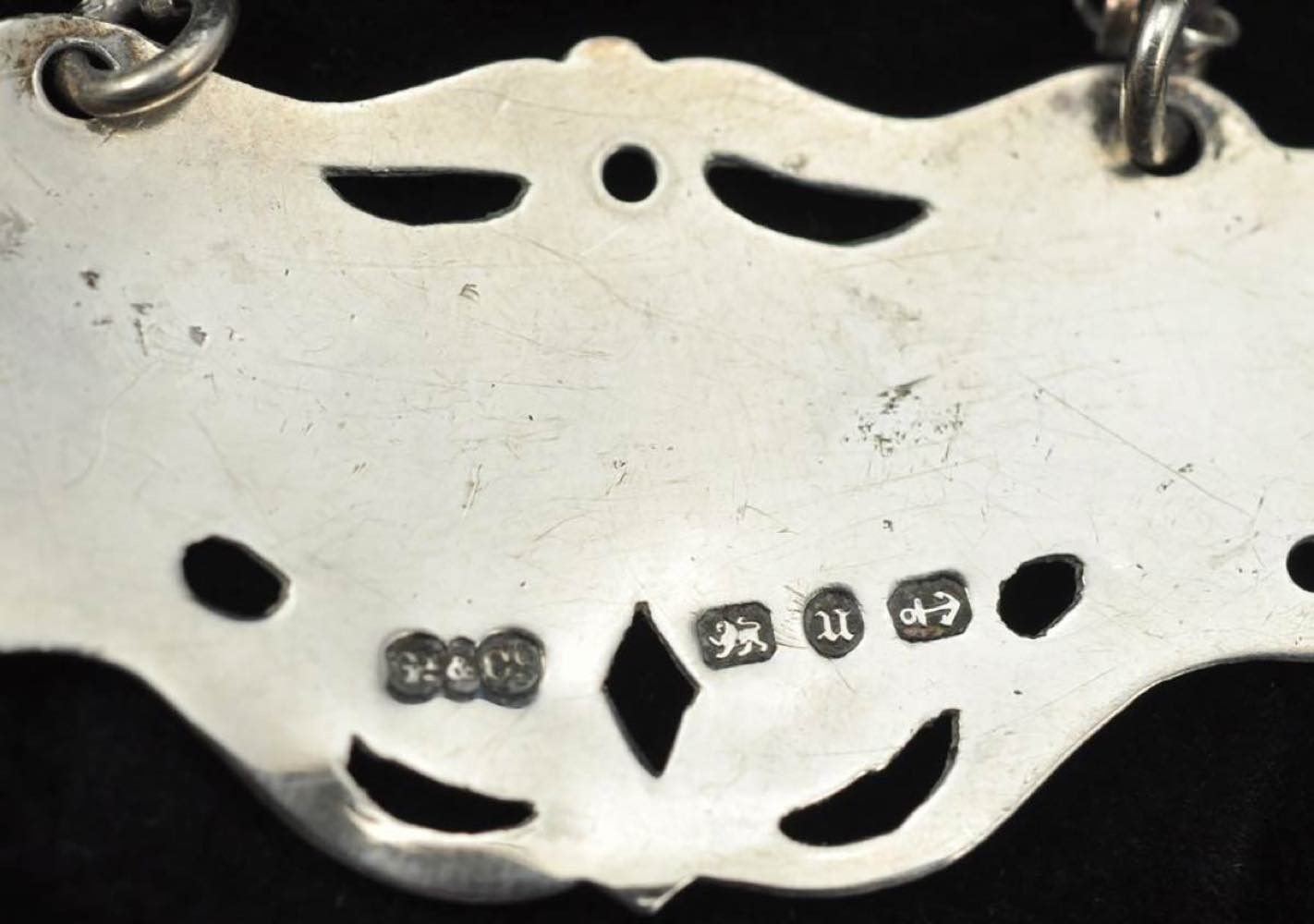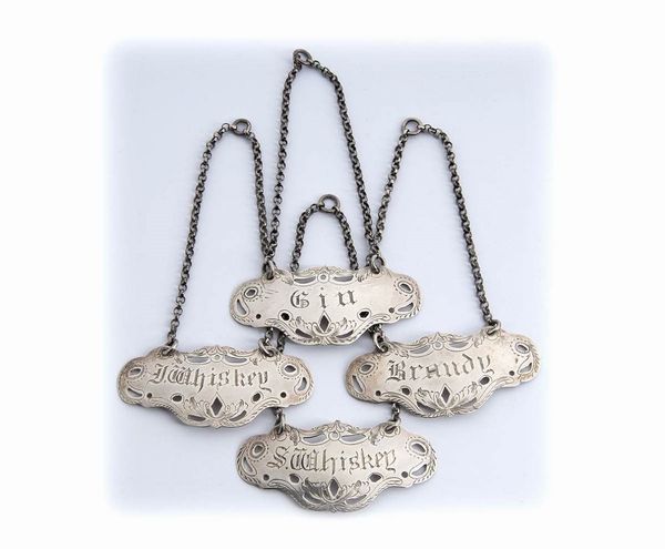 di forma sagomata, decorate con incisioni floreali a taglio luce, presentano le seguenti scritte: Gin, I Whiskey, S Whiskey & Brandy. Argento 925/1000, serie completa di marchi Birmingham 1894-1895, argentieri Grey & Co.