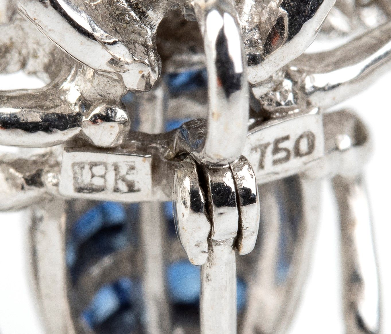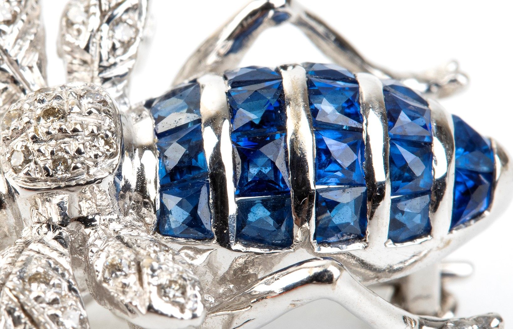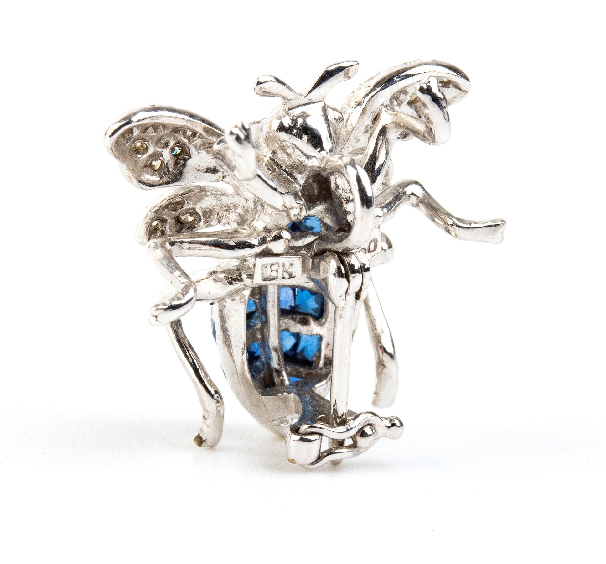 oro bianco 18k, ali incastonate con diamanti e corpo in zaffiri. Diamanti di forma rotonda, taglio brillante 0.15 ct circa, H-I, VS-SI. Zaffiri di forma quadrata, taglio francese 1.80 ct circa. Punzonata 18k.
