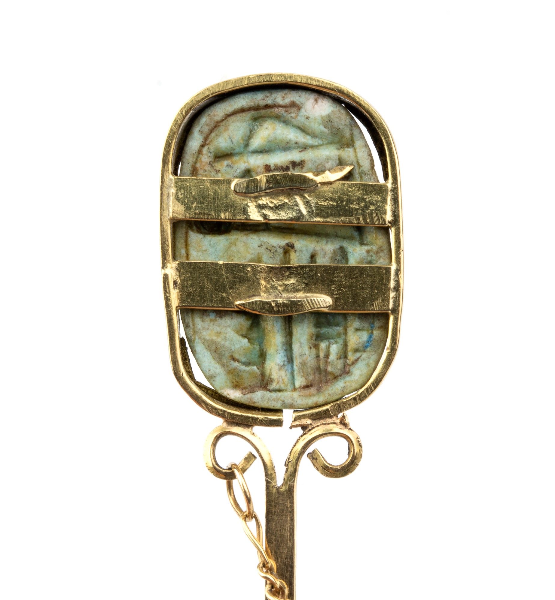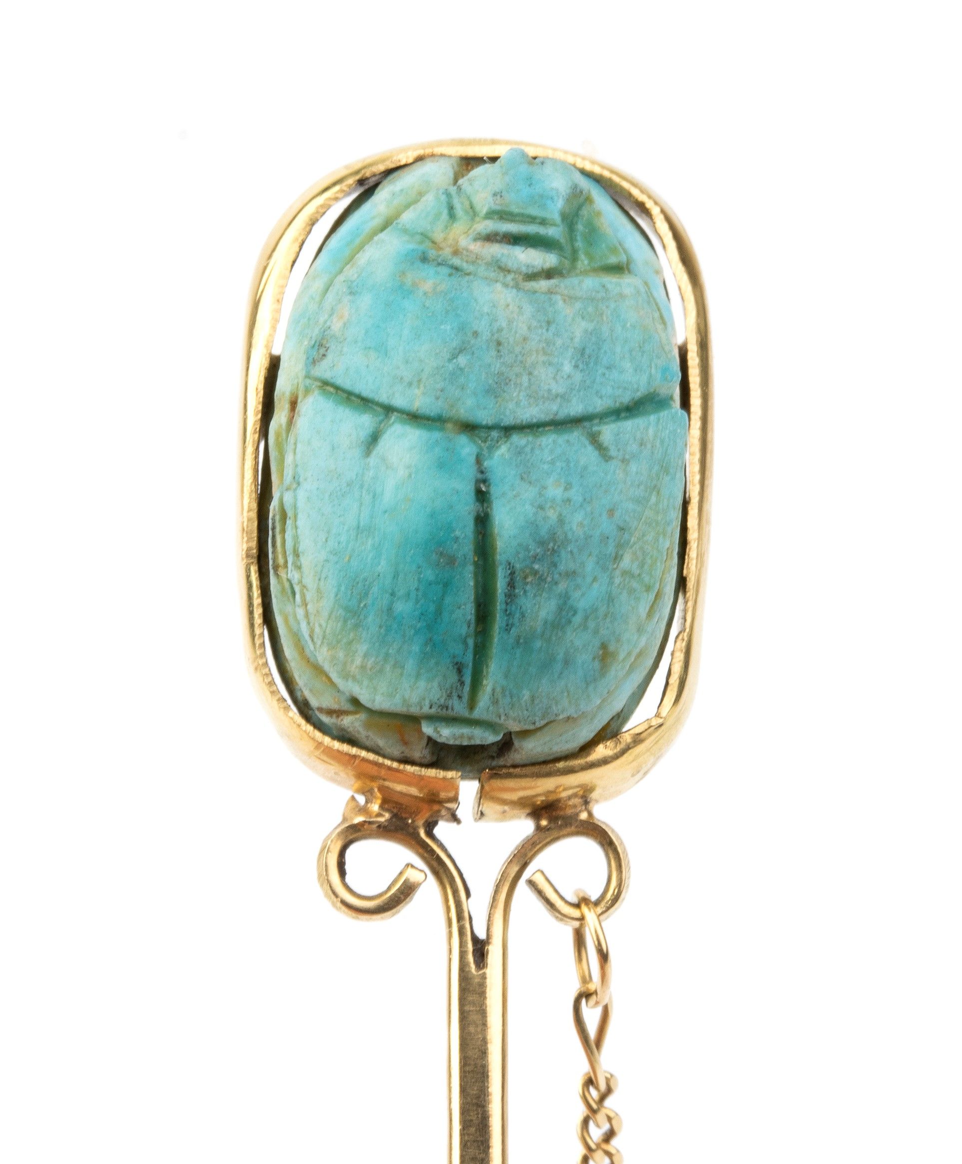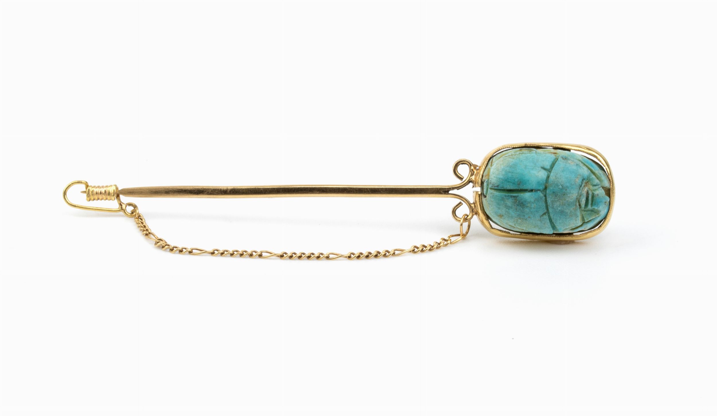 Spillone in oro giallo con scarabeo in pasta vitrea