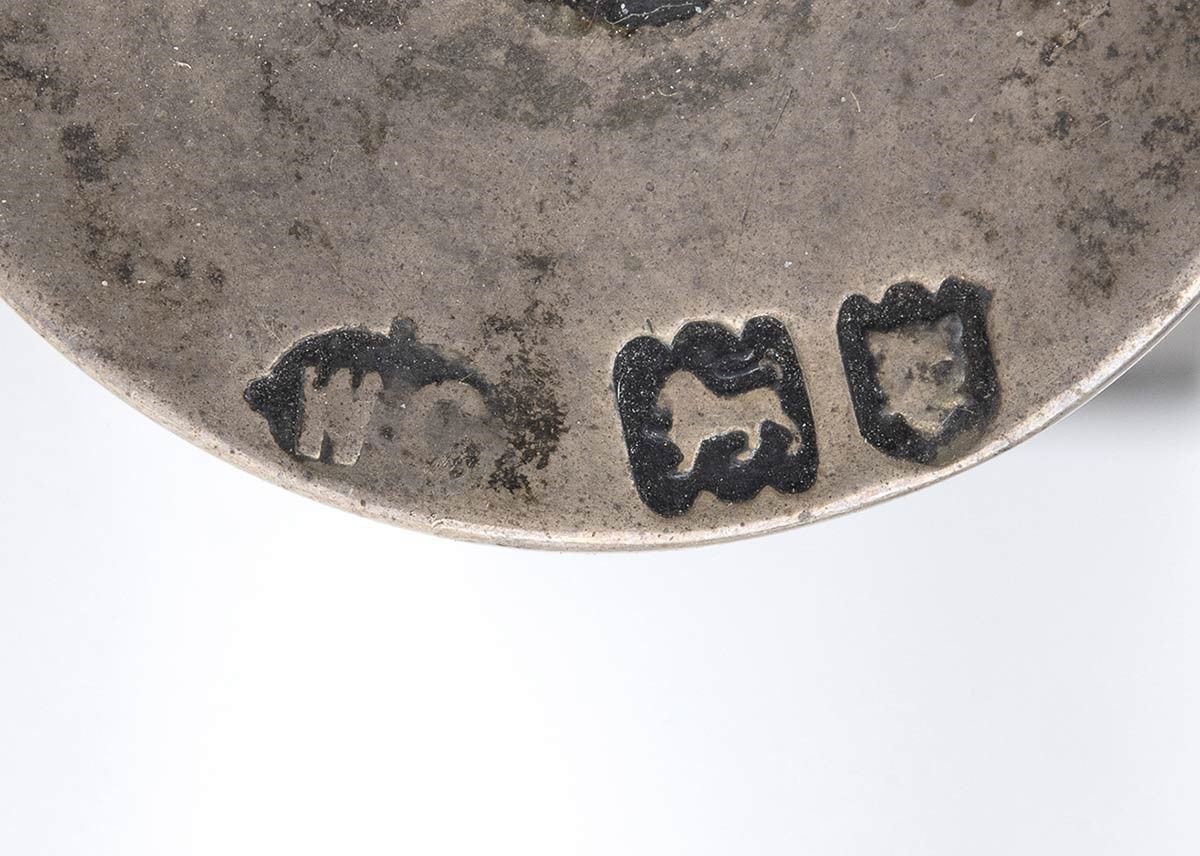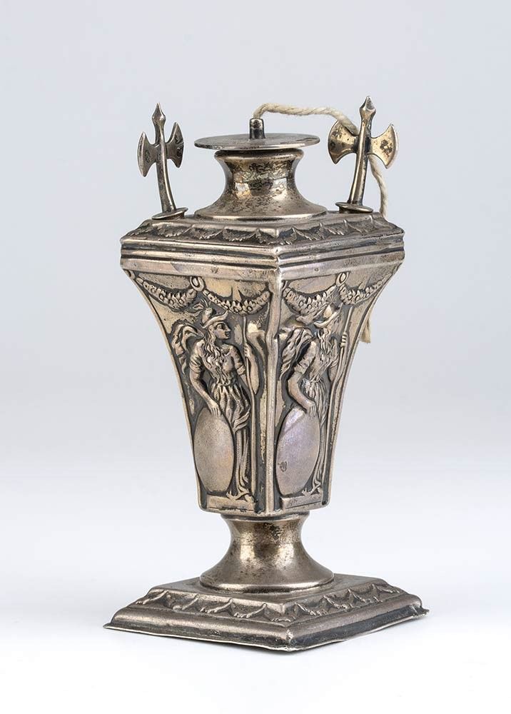 a base quadrata; sui quattro lati è presente la figura della Minerva. Argento 925/1000, serie completa di marchi Londra 1901-1902, maestro argentiere William Comyns & Figli.