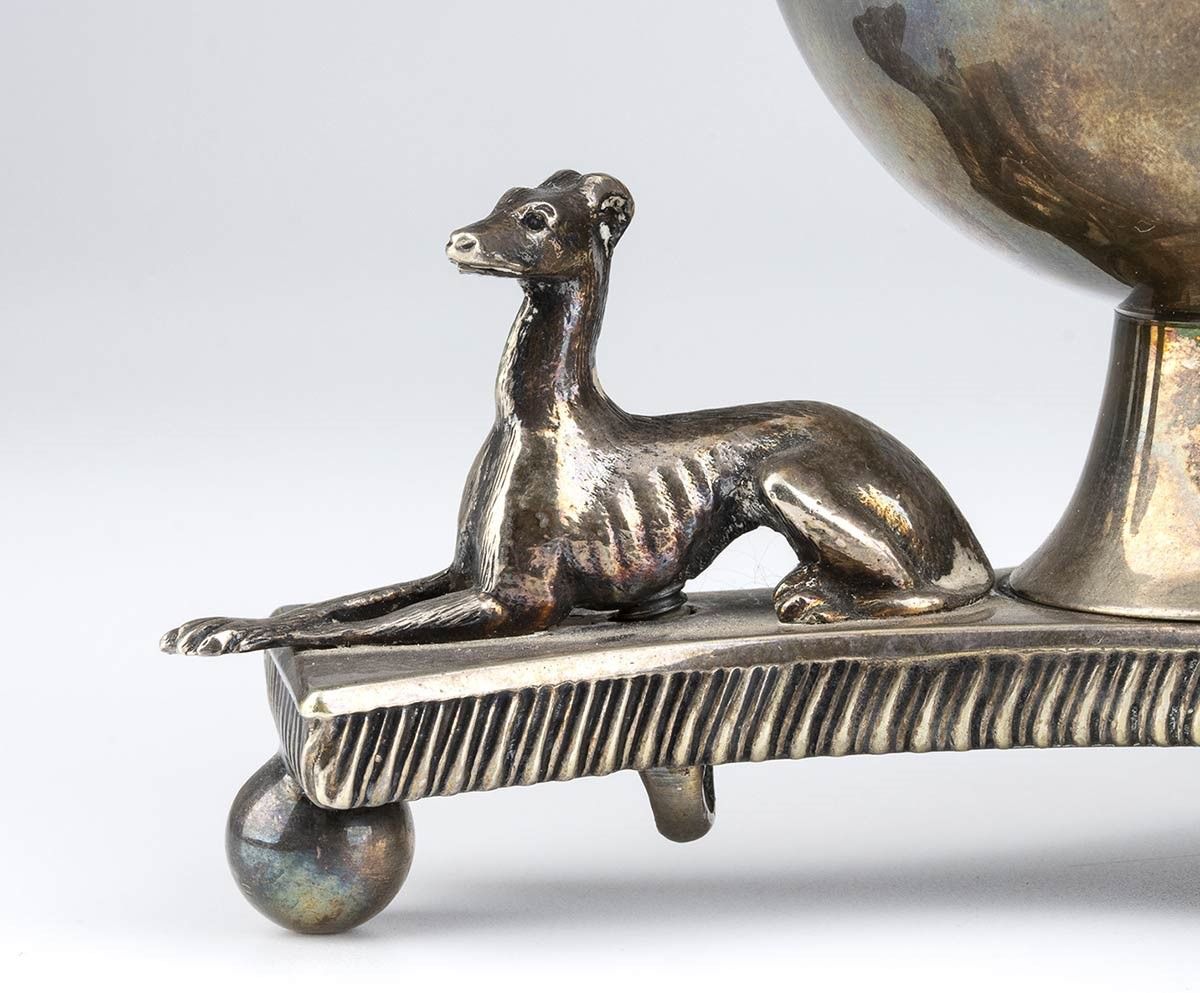 composta da una base dove poggiano le figure di tre cani con al centro un corpo sferico con al vertice lo stoppino. Metallo argentato (E.P.N.S. Electro plated nickel silver),Birmingham 1899, argentiere Elkington & Co.